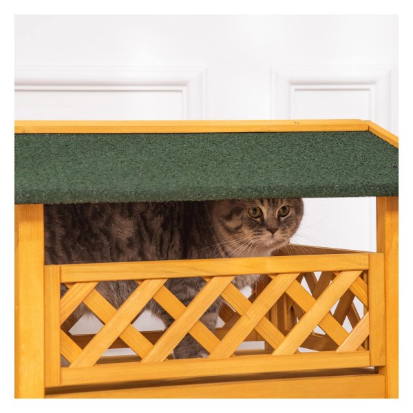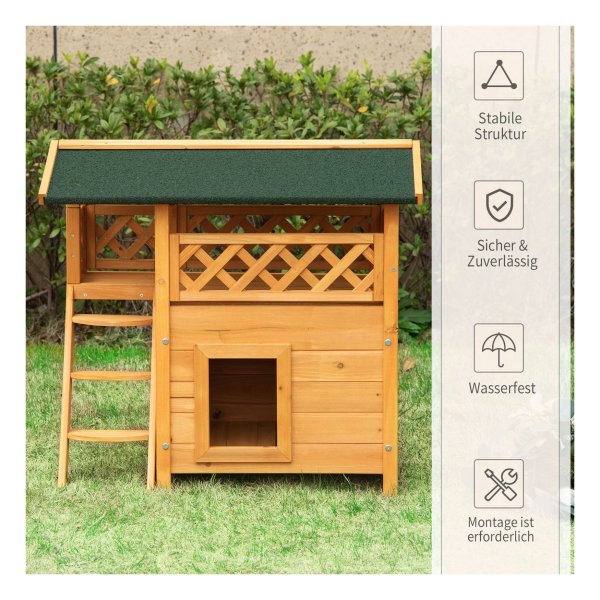 Het kattenhuis is gemaakt van massief Fir-hout, wat duurzaamheid en stevigheid garandeert voor dagelijks gebruik. Het verhoogde ontwerp beschermt je kat tegen kou en insecten, terwijl het ook ventilatie biedt voor een comfortabele omgeving.