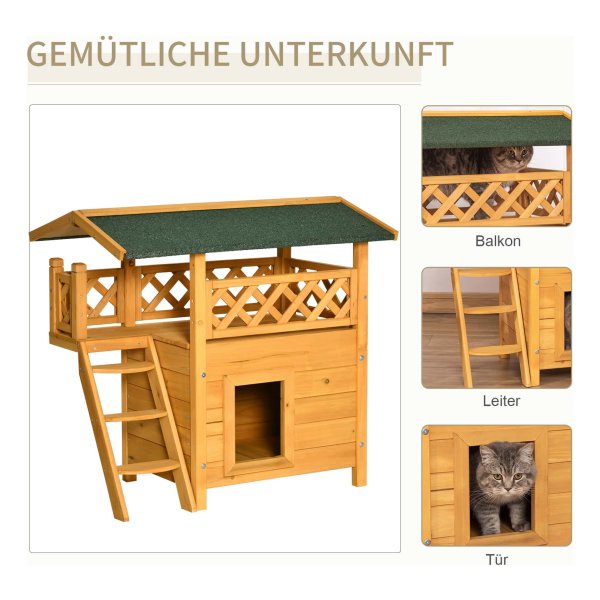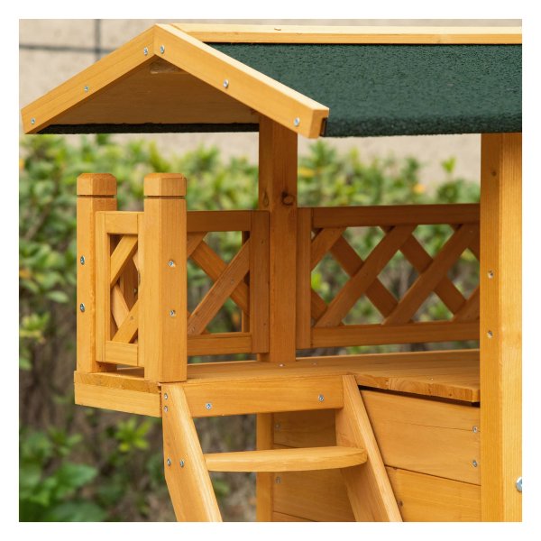 Met een balkon en een houten trap is dit kattenhuis een speels paradijs voor jouw harige vriend. Het geïsoleerde dak beschermt tegen zon en regen, zodat je kat altijd veilig en droog blijft. De decoratieve omheining niet alleen mooi uit, maar biedt ook extra veiligheid voor jouw kat.
