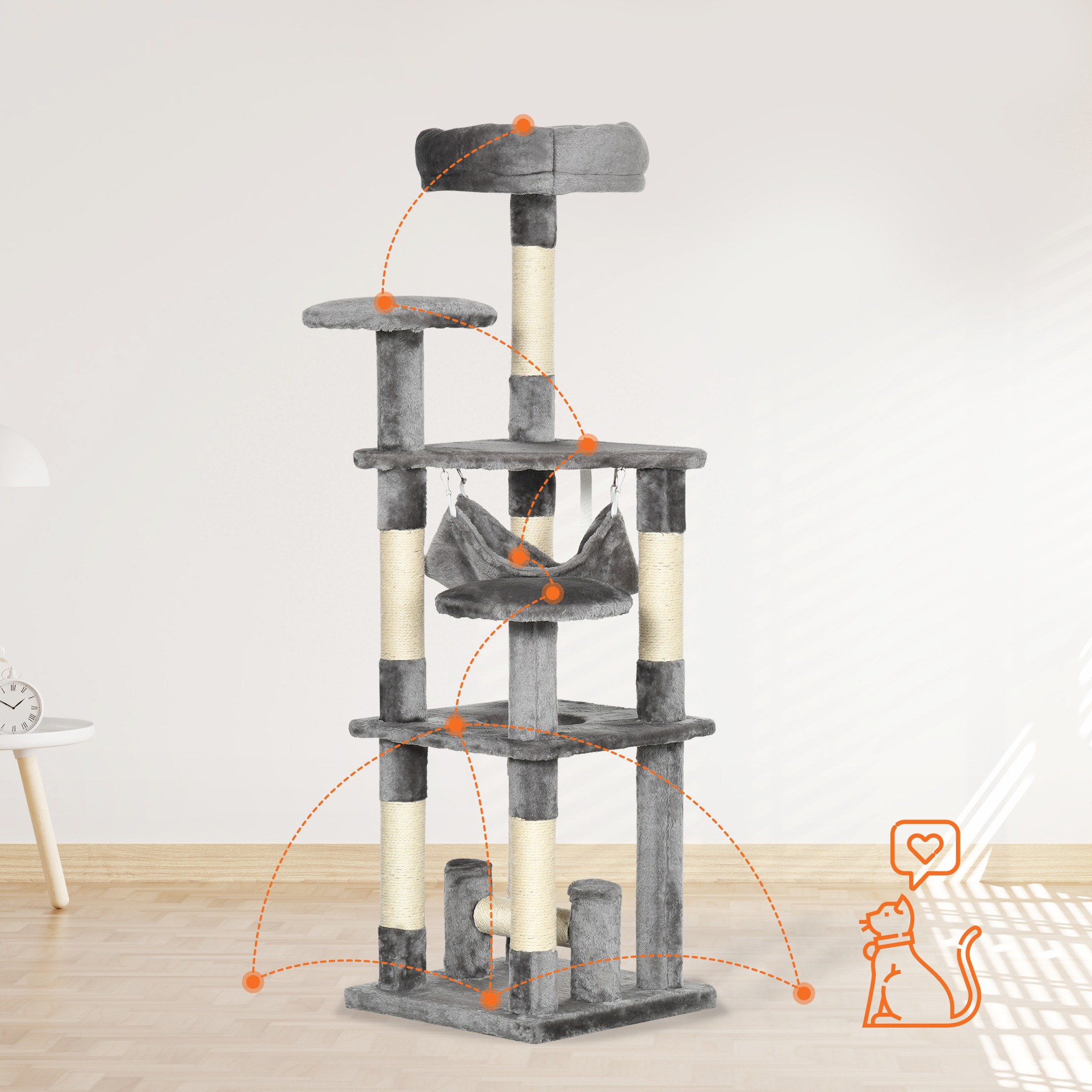 Geef uw kat de perfecte speelervaring met deze veelzijdige klimpaal in een stijlvolle grijze kleur. De verschillende niveaus, drie cirkelvormige platforms, een knusse kattenhangmat en diverse kraselementen maken deze kattenspeeltoren van topkwaliteit.