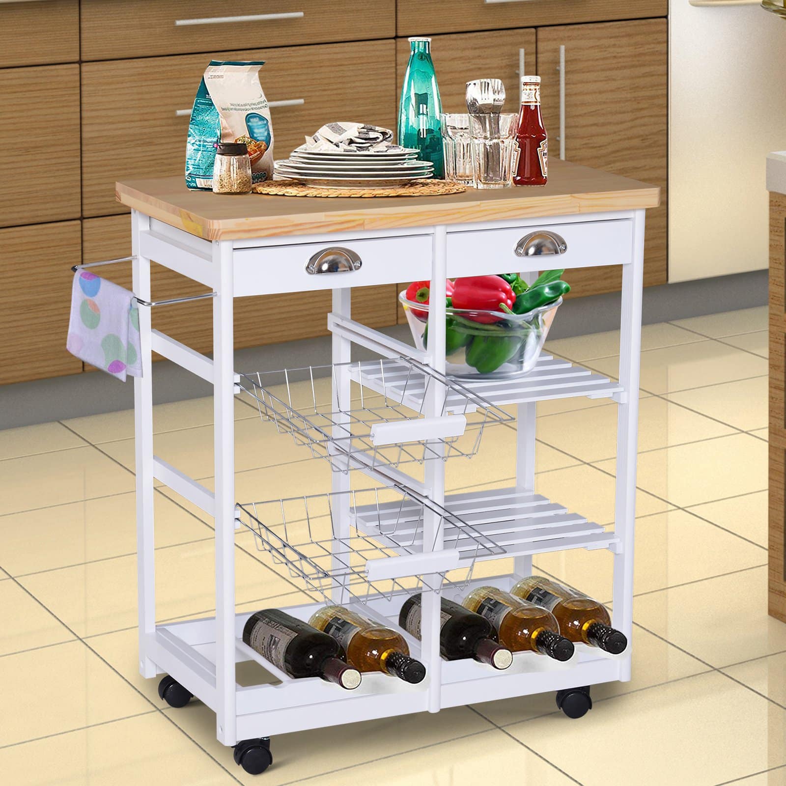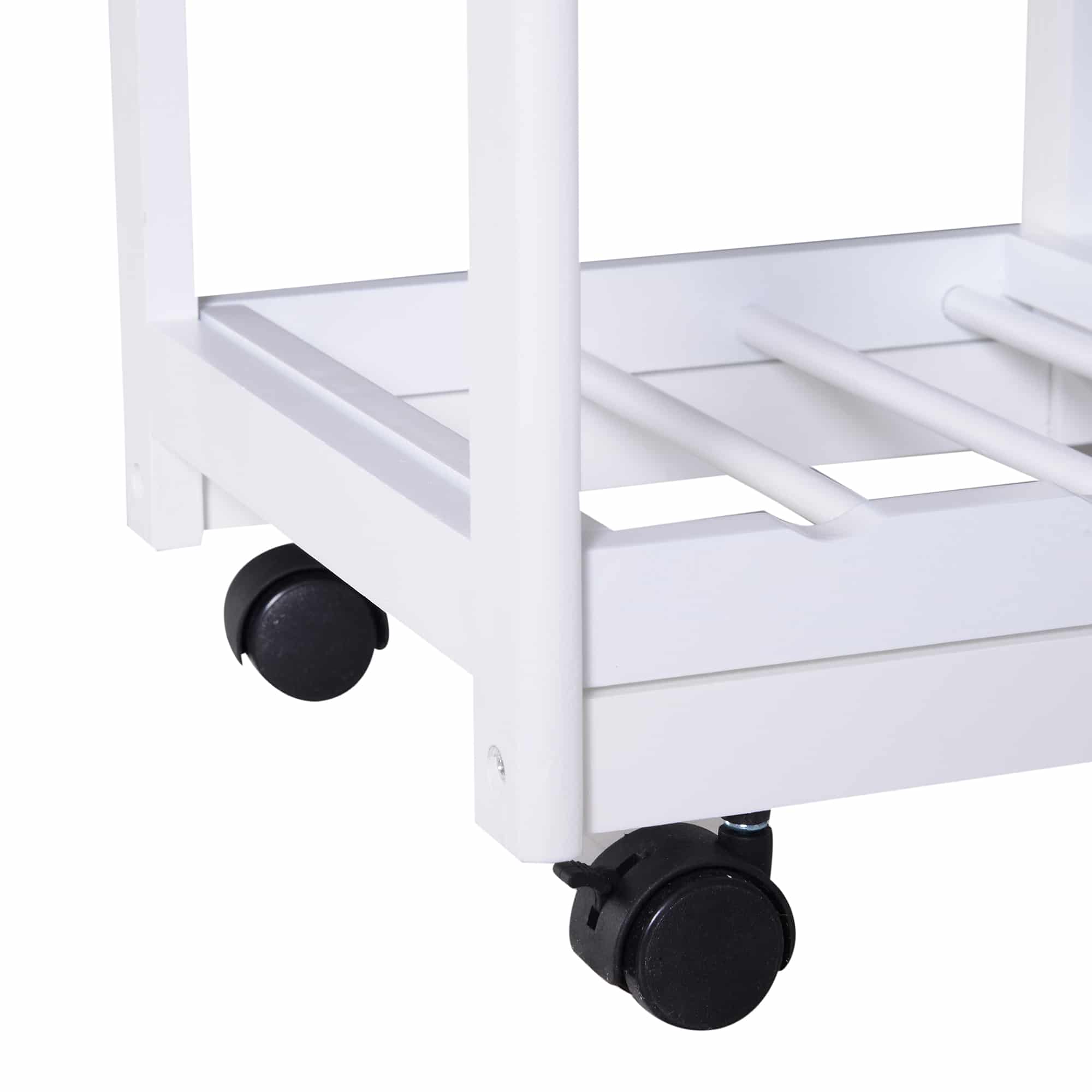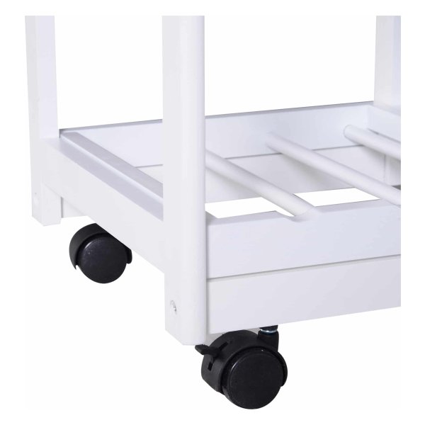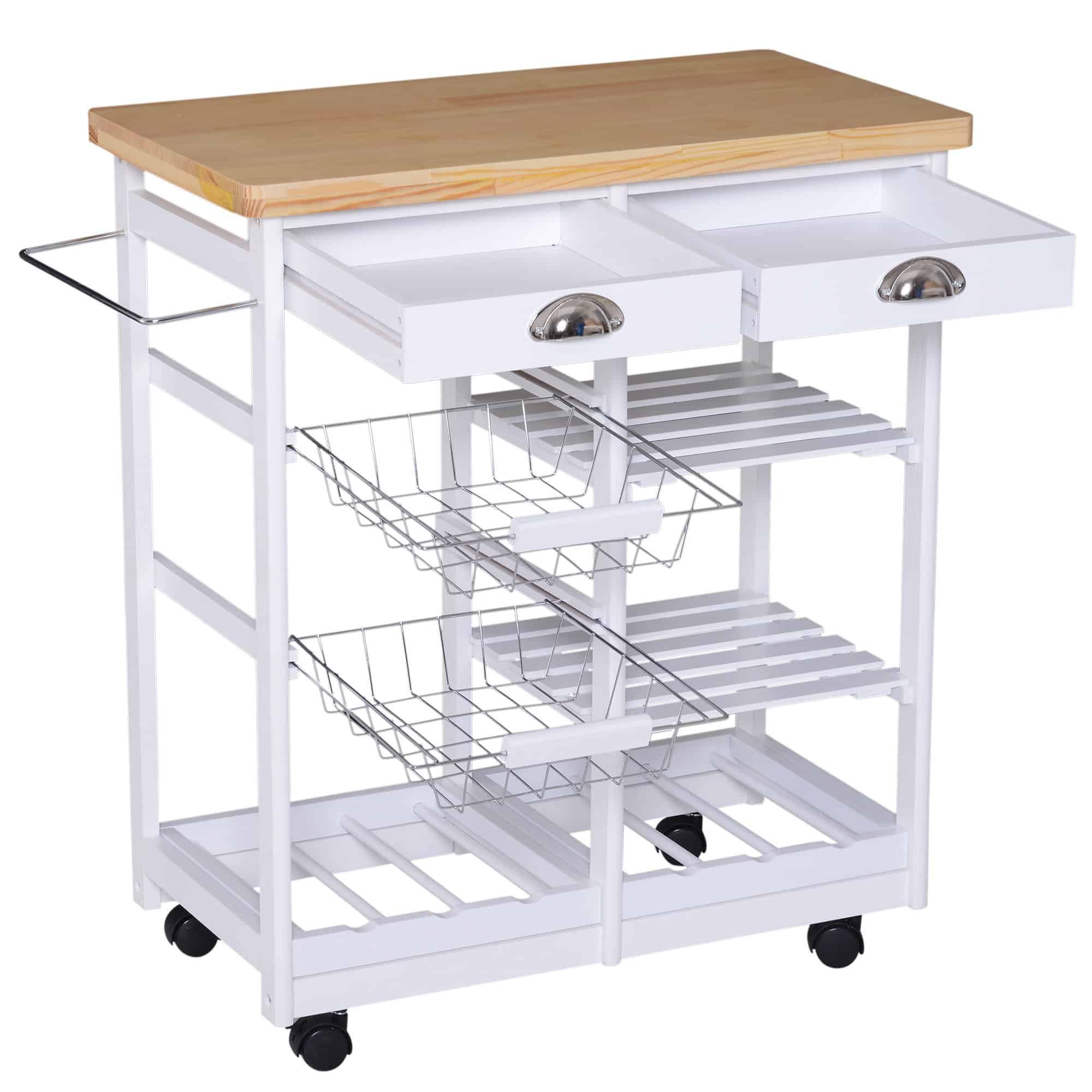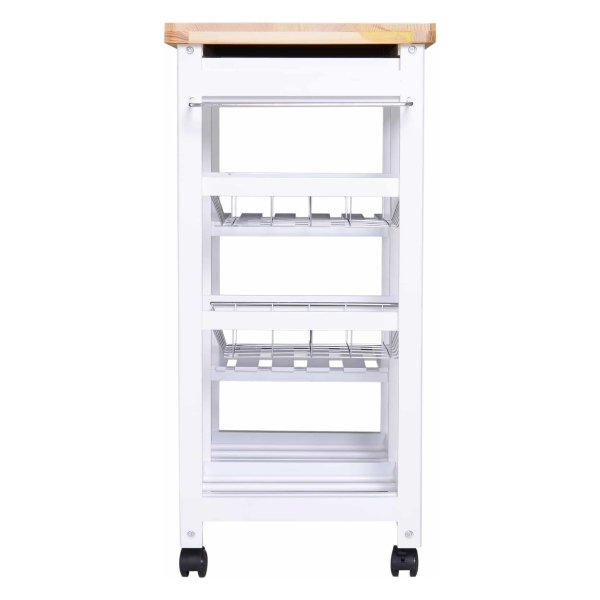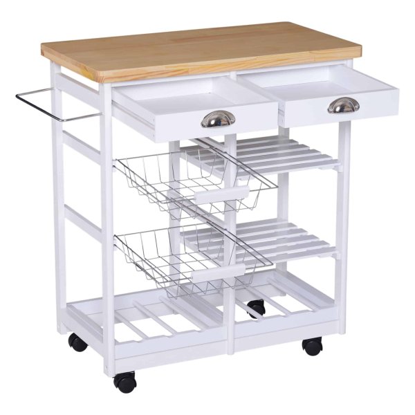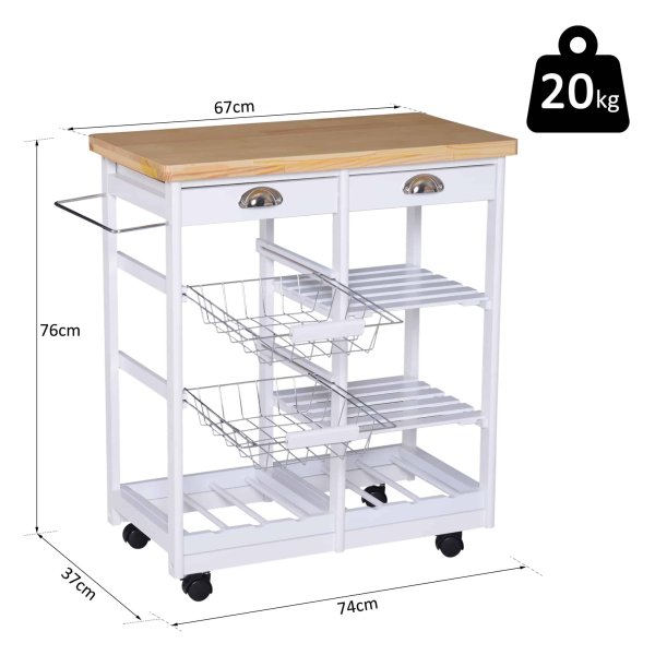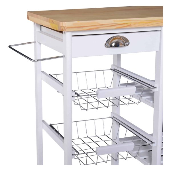 De keukenkar is gemaakt van robuuste MDF-panelen en dennenhout, wat zorgt voor stabiliteit en een hoogwaardige uitstraling. De kar is uitgerust met 4 360° rollen, waarvan 2 kunnen worden vastgezet, zodat je de kar gemakkelijk kunt verplaatsen en positioneren. Met een groot werkblad, 2 laden, 2 manden, 2 opslagcompartimenten en 2 wijnplanken biedt deze keukenkar voldoende opbergruimte voor al jouw keukenspullen.