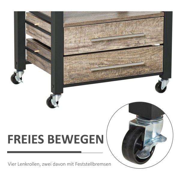 Dankzij de 4 soepel draaiende wielen is de keukenwagen eenvoudig van de ene kamer naar de andere te verplaatsen. Twee van de wielen zijn tevens uitgerust met remmen, waardoor u de wagen veilig op zijn plaats kunt houden.