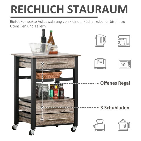 De keukenwagen is voorzien van maar liefst 3 praktische laden en een ruime open plank, waardoor u al uw keuken- en voedselgerei gemakkelijk kunt opbergen en organiseren. Hierdoor heeft u altijd alles bij de hand tijdens het koken of serveren.