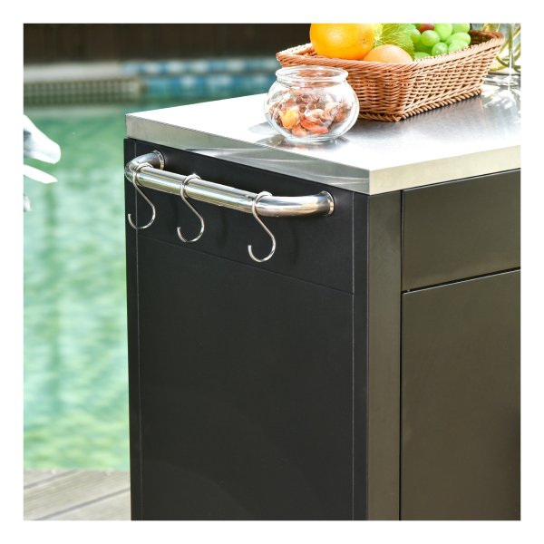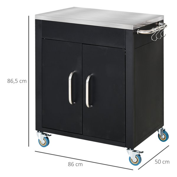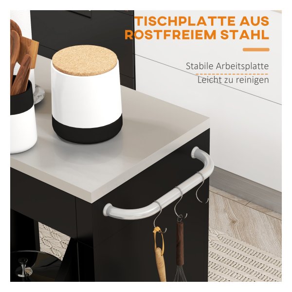 - De keukentrolley heeft een roestvrijstalen bovenblad dat ruimte biedt voor het bereiden van gerechten en gemakkelijk schoon te maken is.