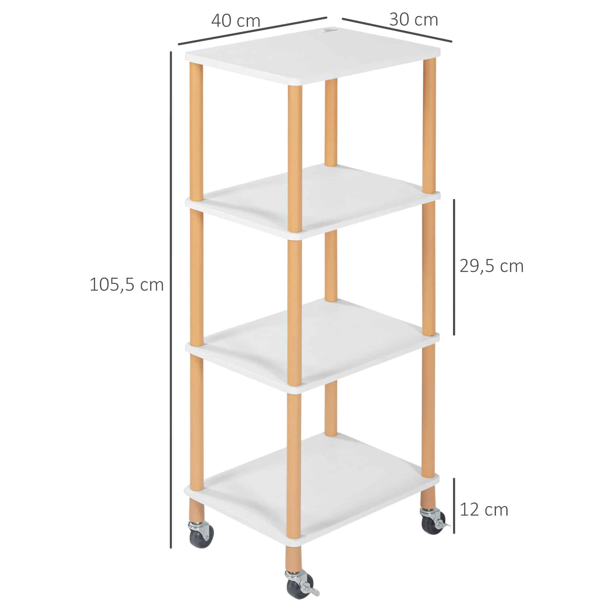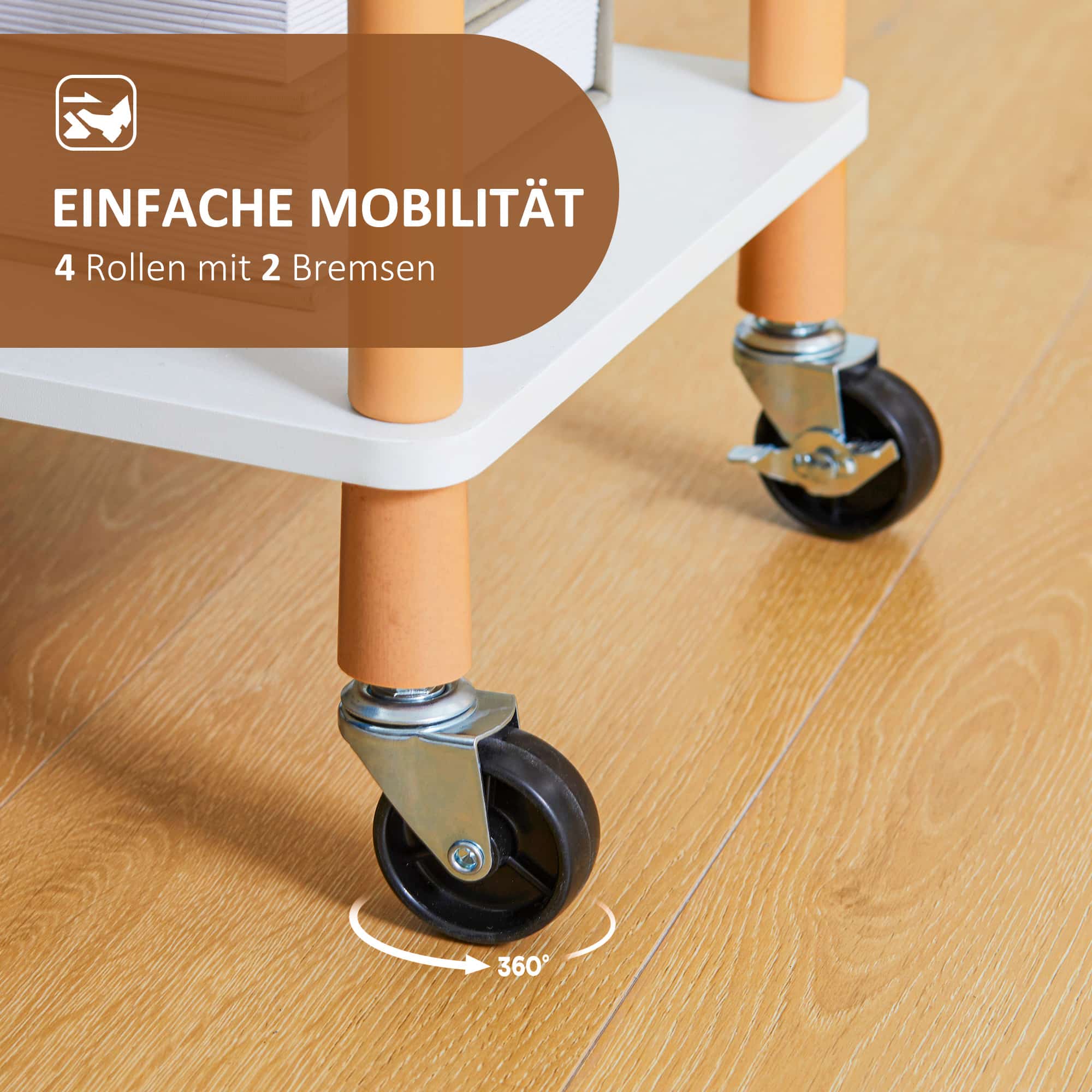- Met vier soepele wielen, waarvan twee met remmen, is de serveerwagen eenvoudig te verplaatsen en te vergrendelen op de gewenste plek.