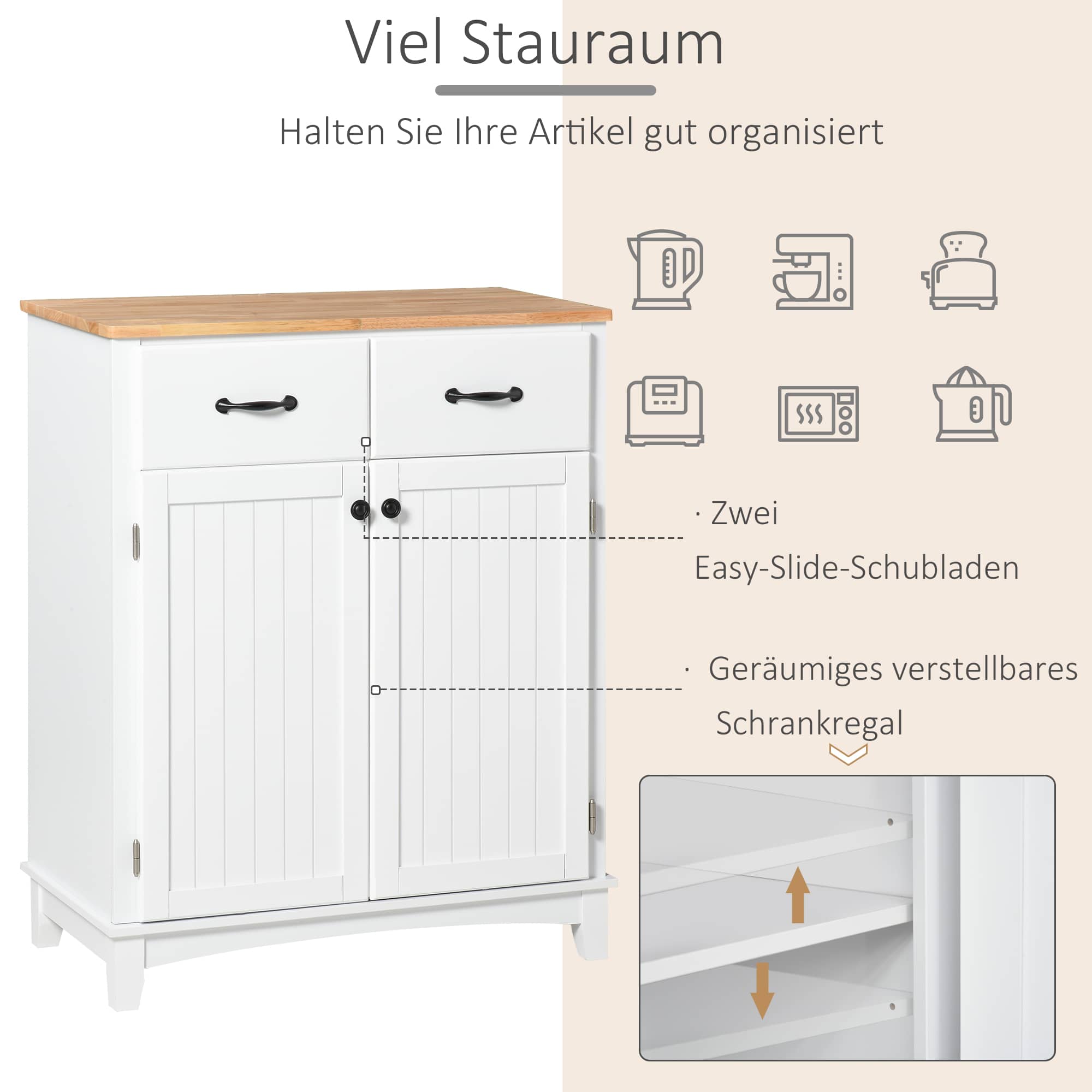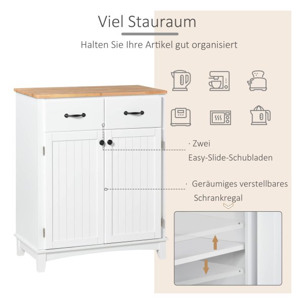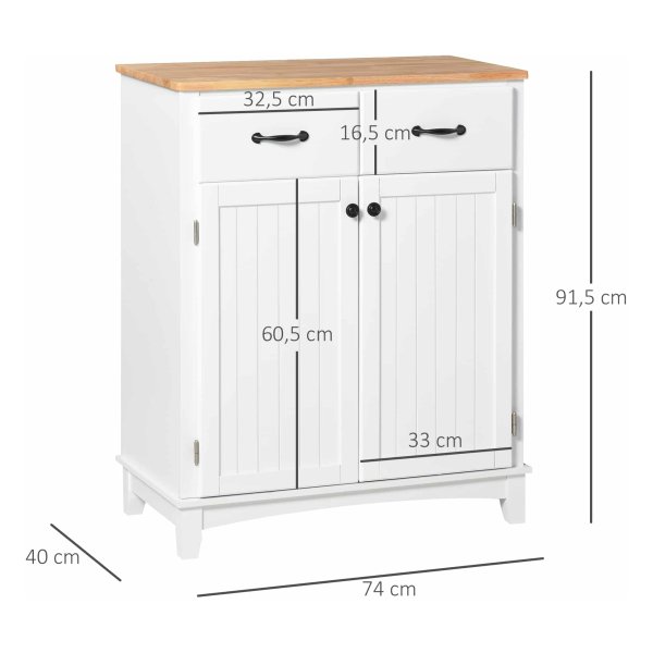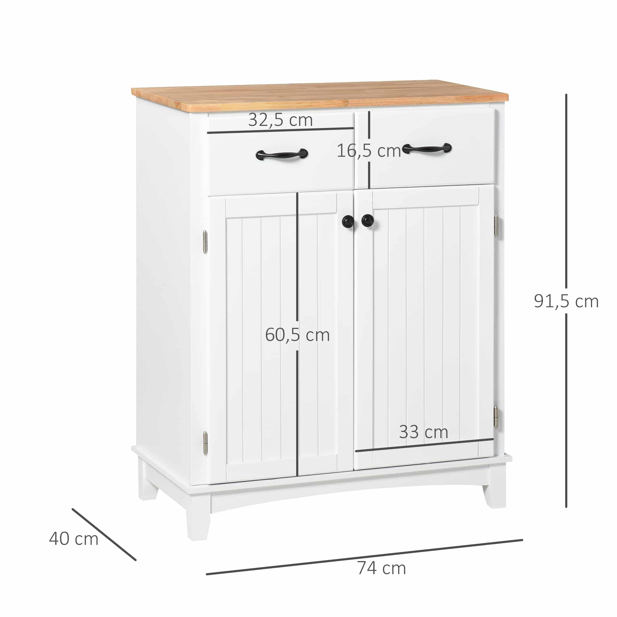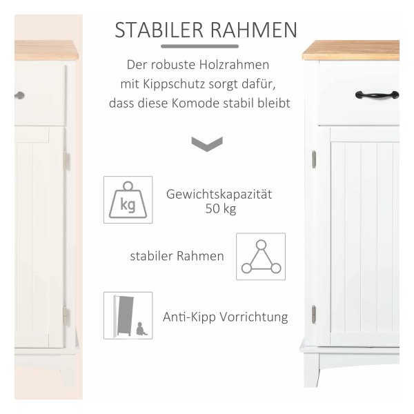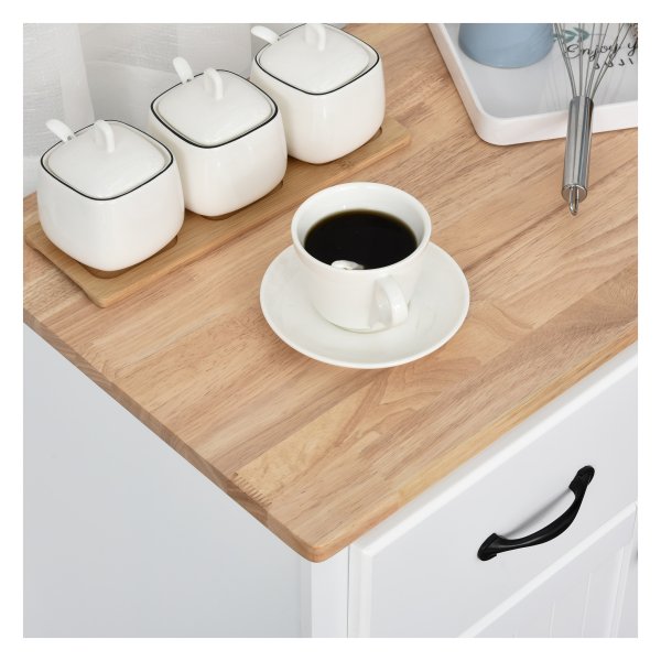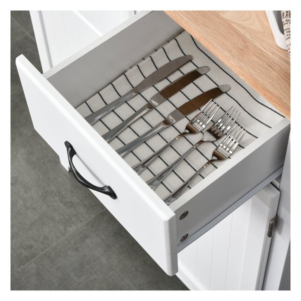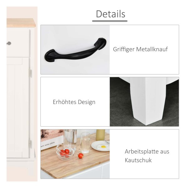 Het keukenkastje van FlexiHome is uitgevoerd in wit en past perfect in elke keuken. Het is gemaakt van hoogwaardig MDF en heeft een werkblad van natuurlijk rubberhout, wat zorgt voor een robuuste constructie. Dit kastje heeft ook een kantelbeveiliging voor extra stabiliteit.