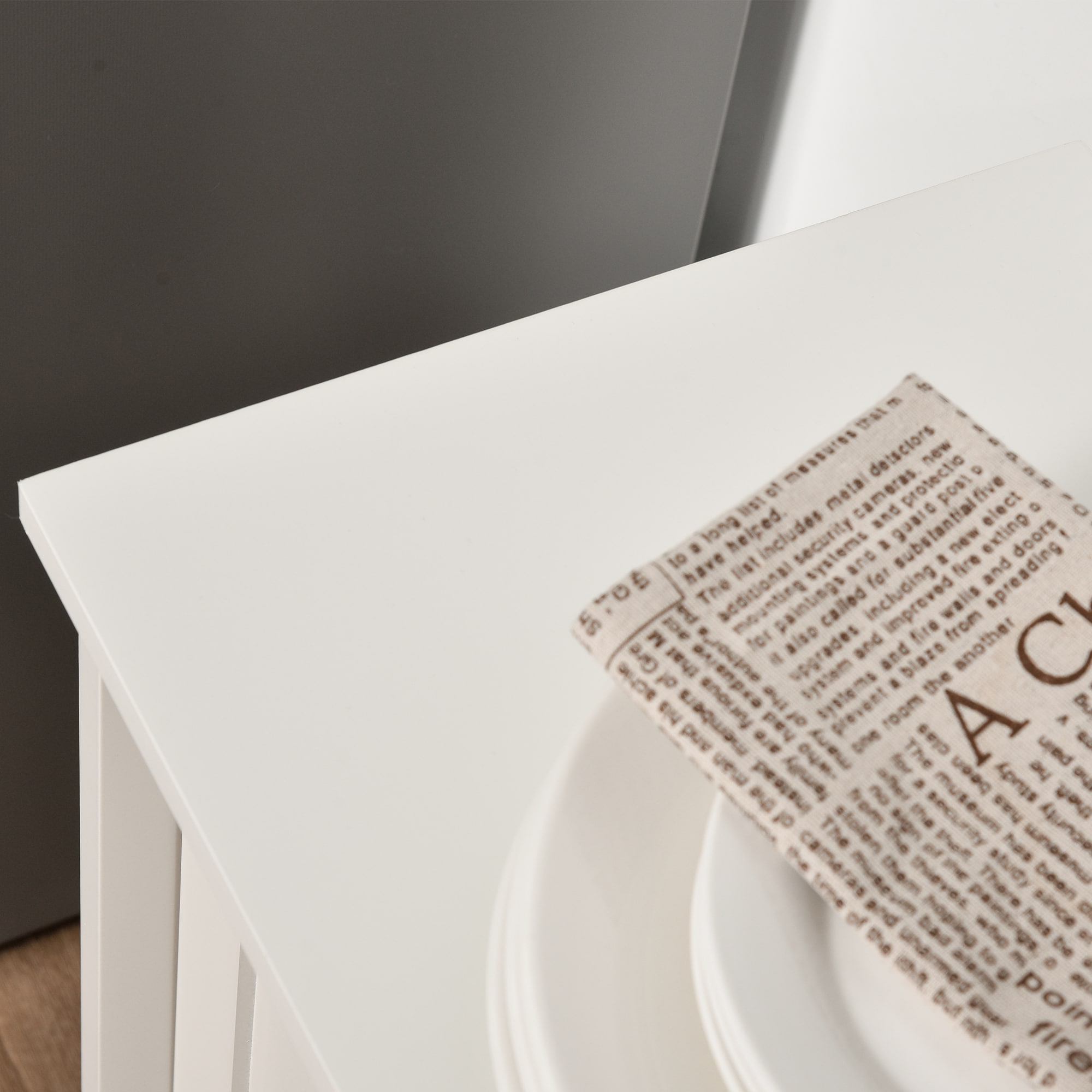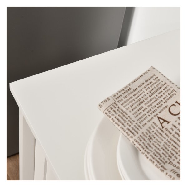 De bijzetkast is uitgevoerd in een elegante witte kleur en gemaakt van hoogwaardig MDF materiaal. De afmetingen van de kast zijn 106,5B x 33D x 63H cm, met planken van 101L x 27B x 28/28H cm. De kast kan tot 50 kg dragen en wordt geleverd met duidelijke montage-instructies.