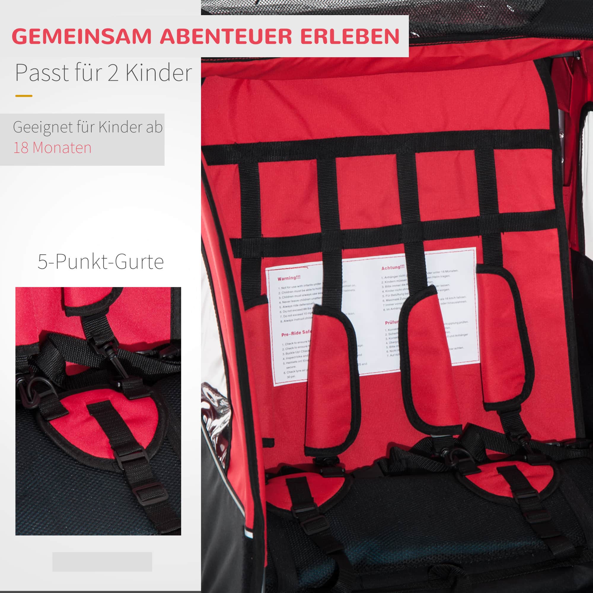 De kinderaanhanger biedt ruimte aan maximaal twee kleine kinderen tot 9 kg elk. De comfortabele zittingen zorgen ervoor dat ze zich op hun gemak voelen tijdens de rit. De aanhanger is uitgerust met reflectoren en een vlag voor extra zichtbaarheid en veiligheid op de weg.