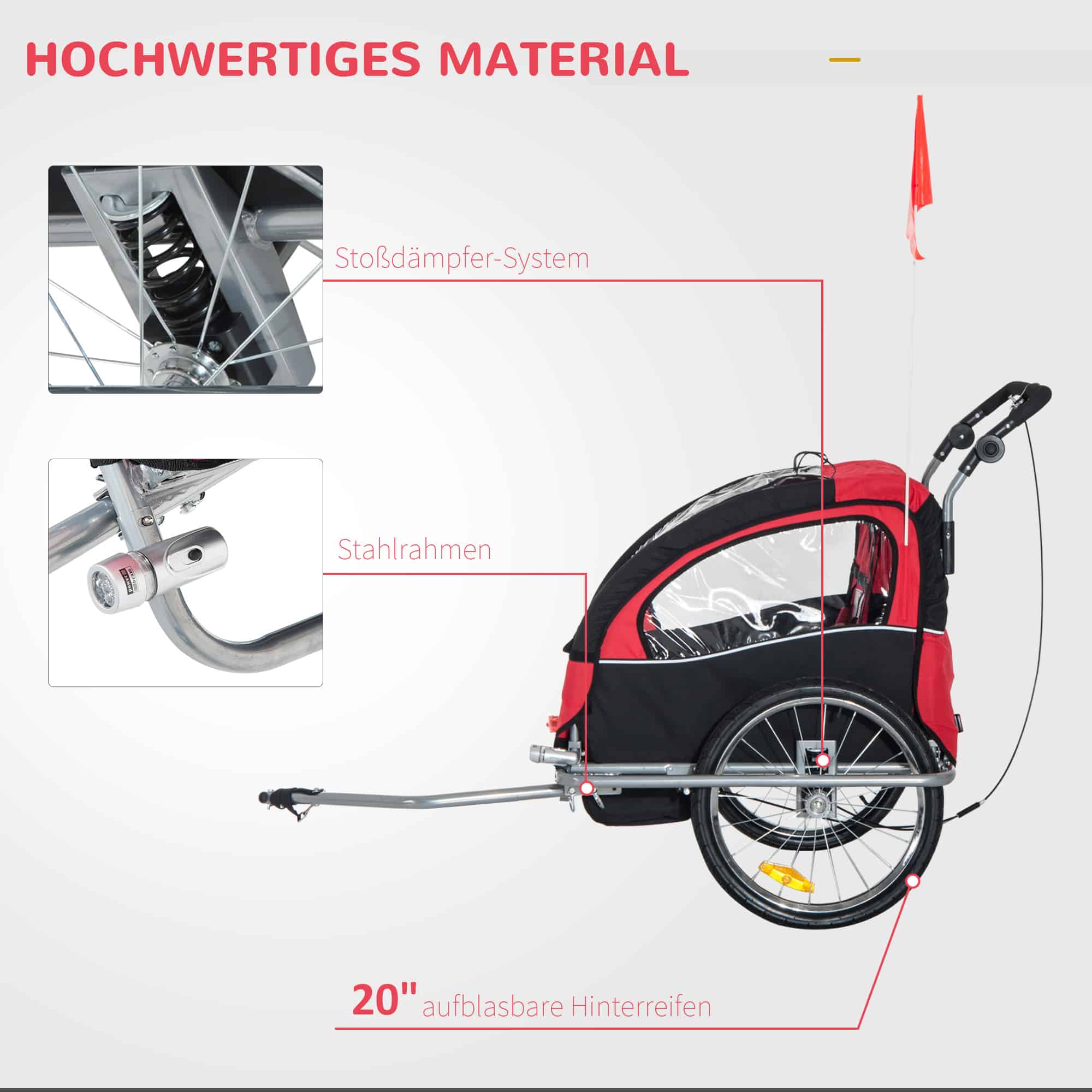Dankzij de luchtgevulde banden en de volledig geveerde achteras kunnen jij en je kinderen comfortabel reizen, zelfs op ruwere ondergronden. De kinderaanhanger is ontworpen om een soepele en aangename rit te garanderen, ongeacht het terrein.