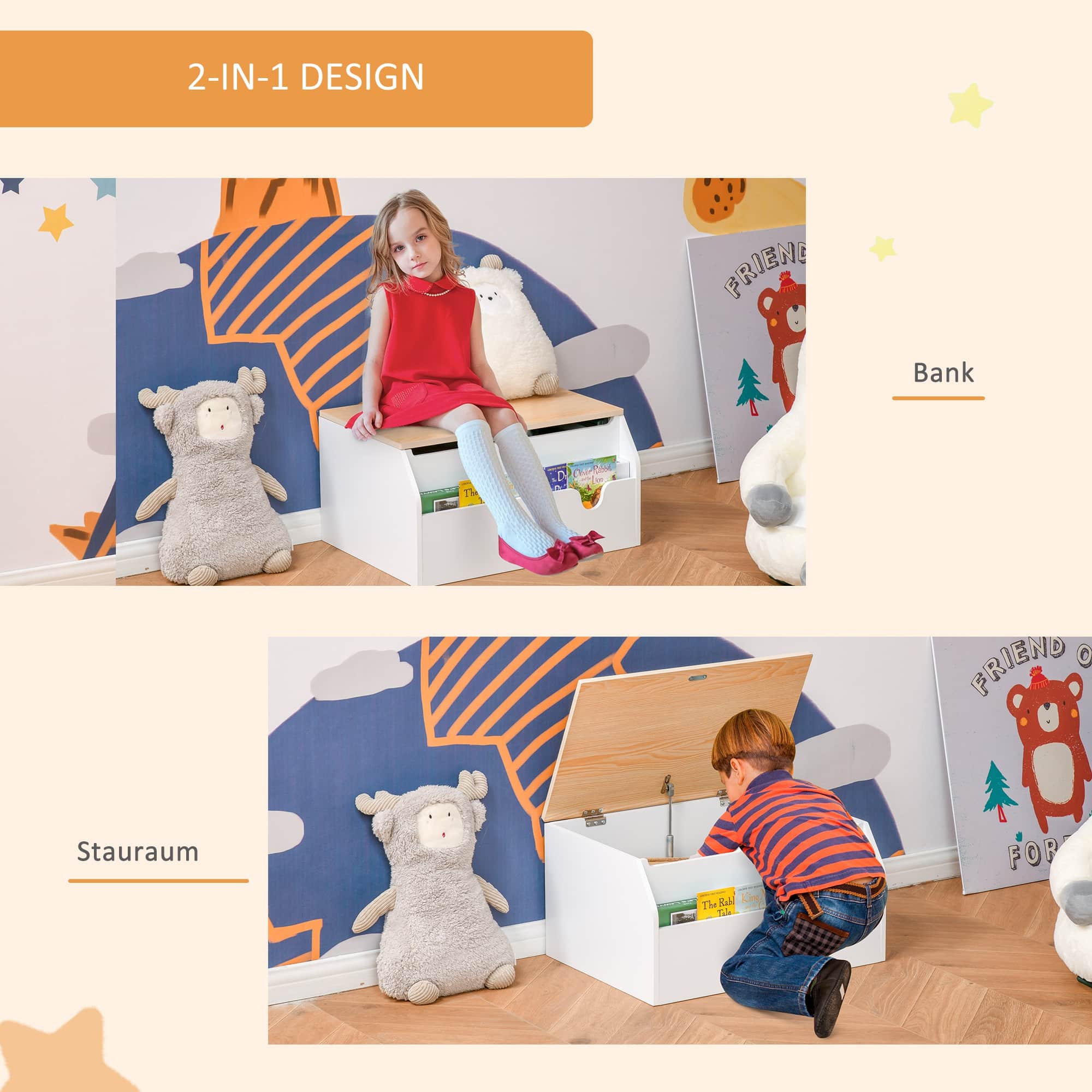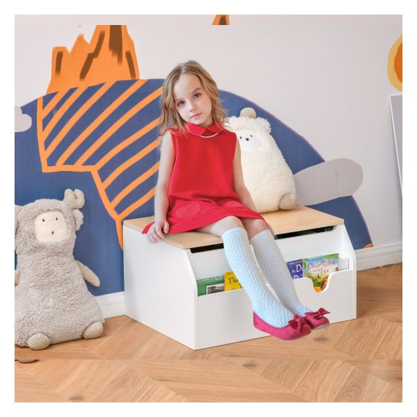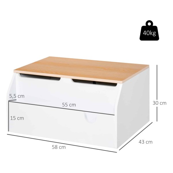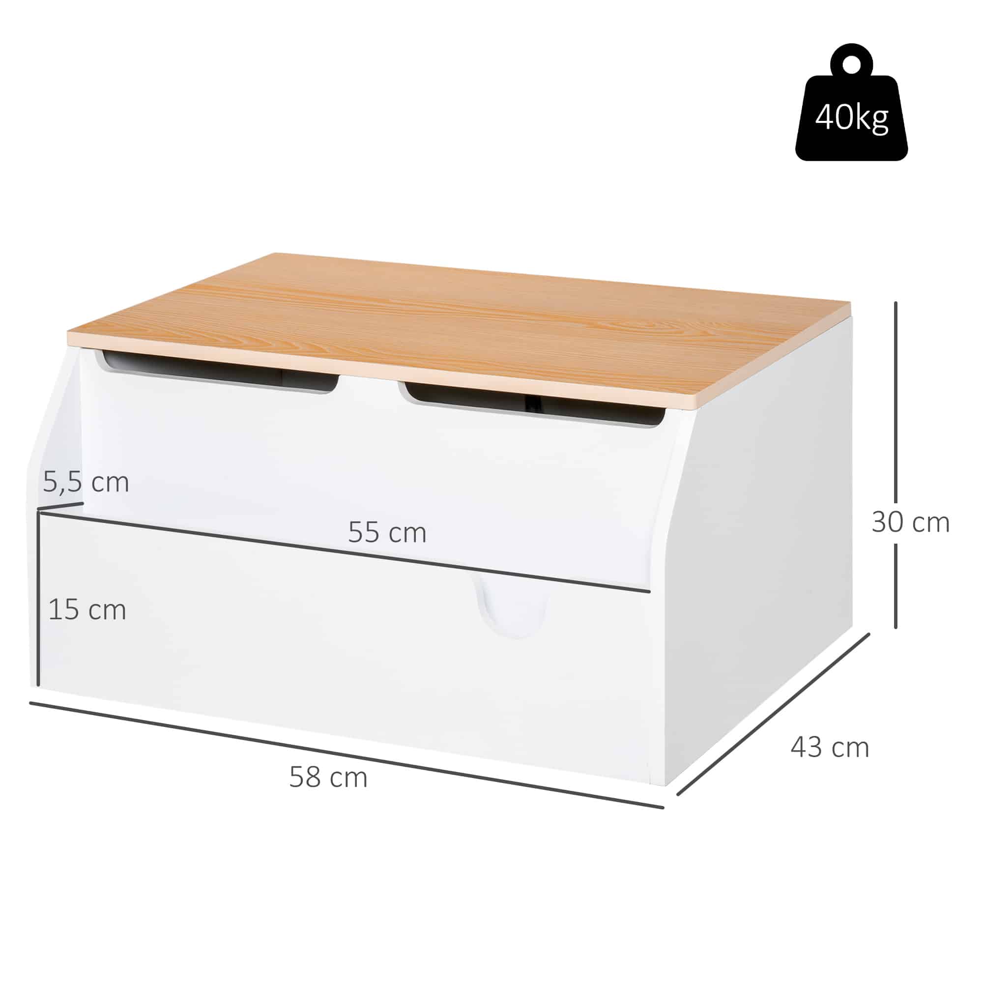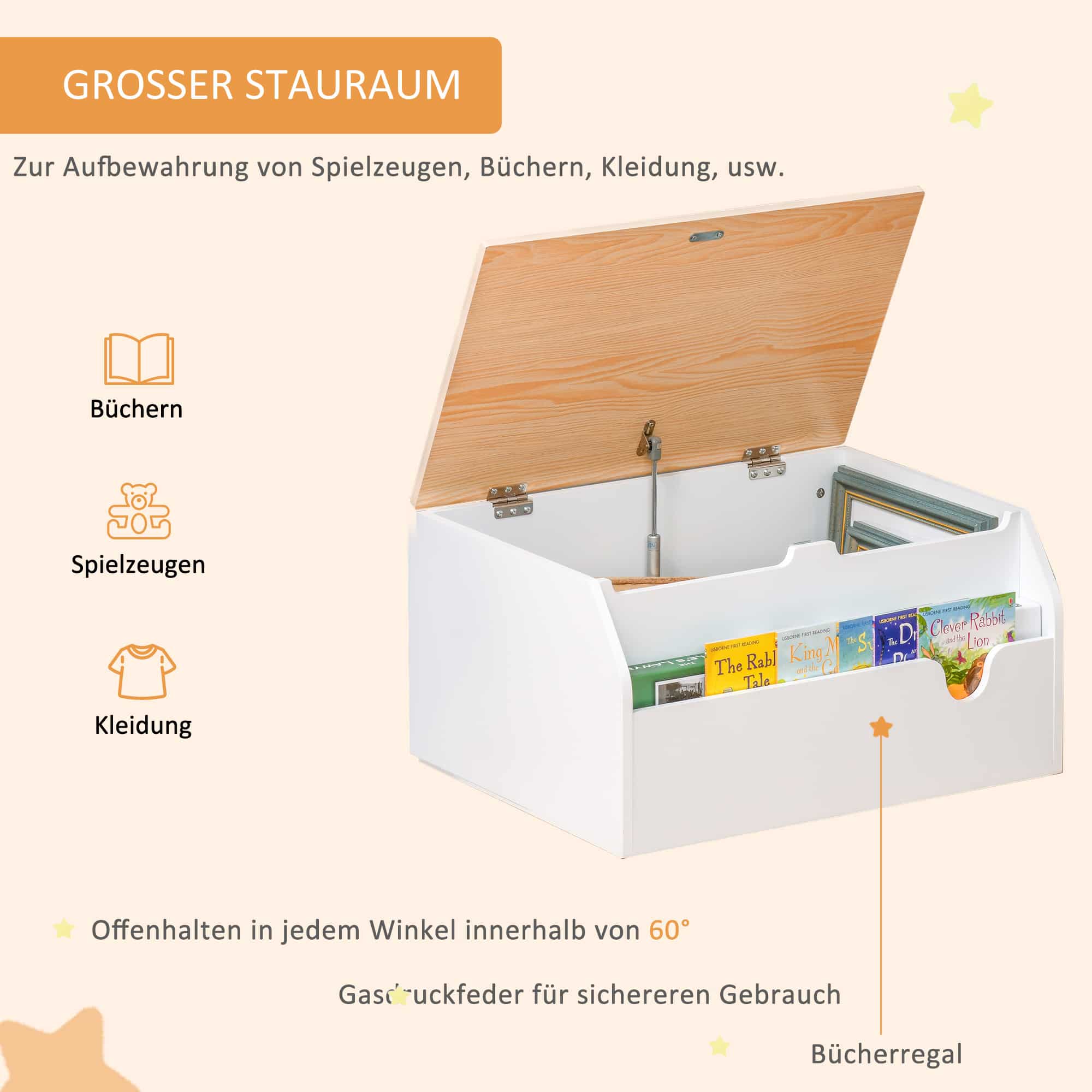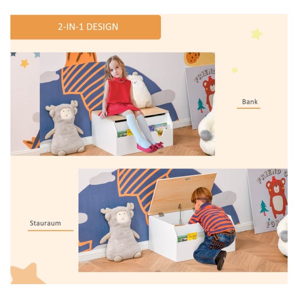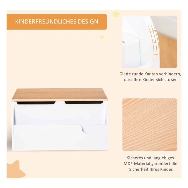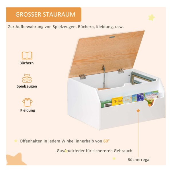 De speelgoedkist heeft een deksel dat tot 60 ° kan worden geopend, waardoor gemakkelijke toegang tot een grote opbergruimte mogelijk is. Hier kunnen al het speelgoed, boeken, kleding en meer worden opgeborgen, waardoor de kinderkamer netjes en opgeruimd blijft.
