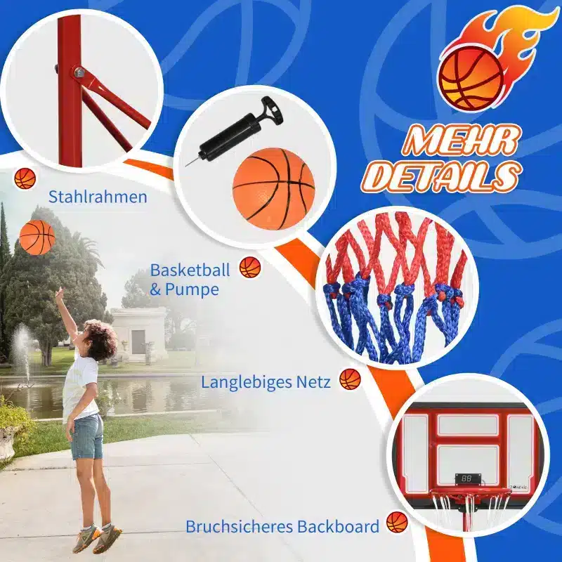 Met de elektronische puntenweergave op de achterwand kunnen spelers en toeschouwers eenvoudig de scores bijhouden, wat het spel nog spannender maakt. De verstelbare hoogte maakt het mogelijk voor kinderen en volwassenen om te genieten van het basketballen. De comfortabele zandvulling zorgt ervoor dat de basketbalstandaard stevig blijft staan tijdens het spelen.