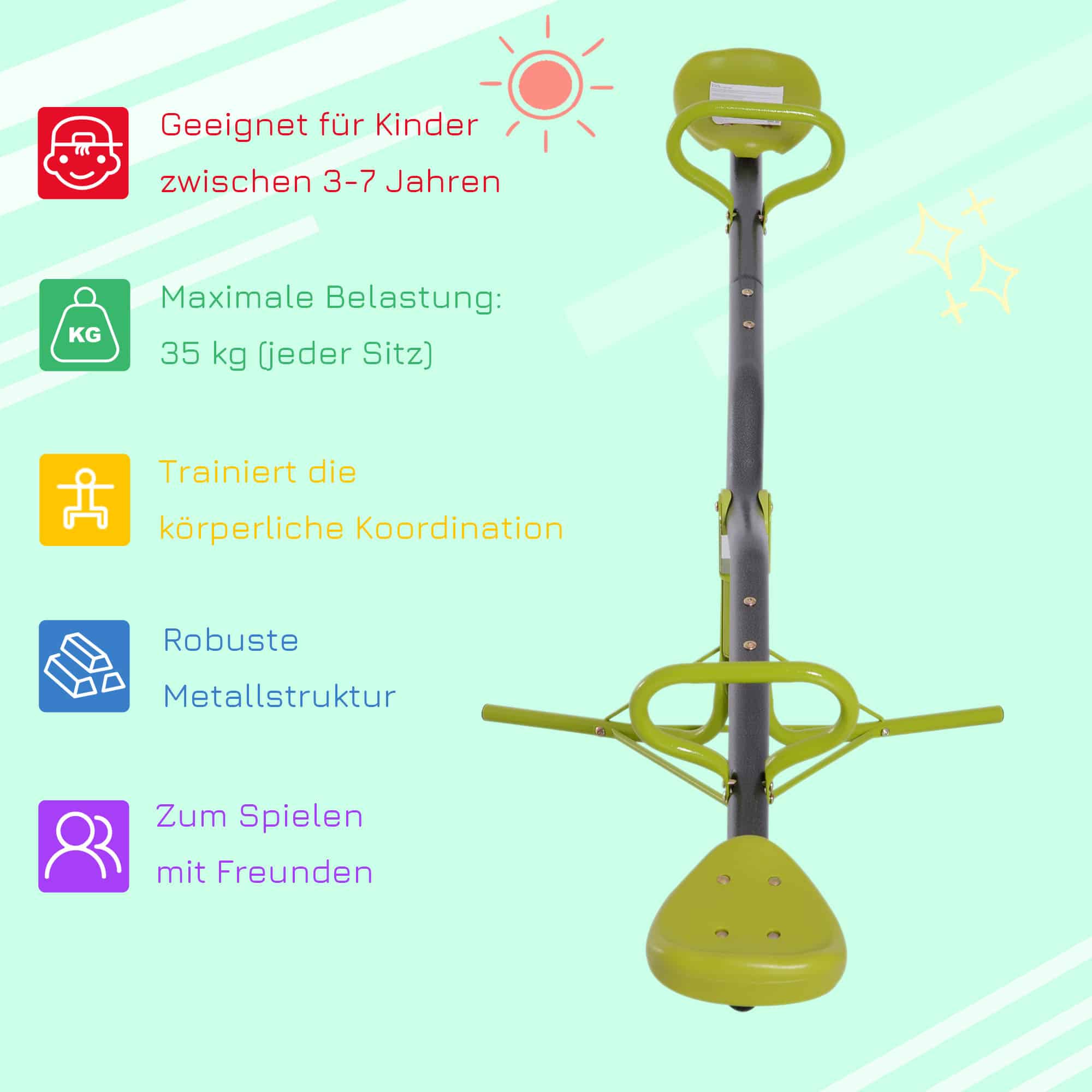 Het SwingKing Metalen wip tuinspeeltoestel in het groen is een fantastische toevoeging aan elke tuin. Met zijn unieke 360 graden draaibare design zorgt dit speeltoestel voor urenlang vermaak voor kinderen tussen de 3 en 10 jaar oud. Het gepoedercoate metalen frame zorgt voor stabiliteit en duurzaamheid, terwijl de statiefbasis extra stabiliteit biedt tijdens het spelen.