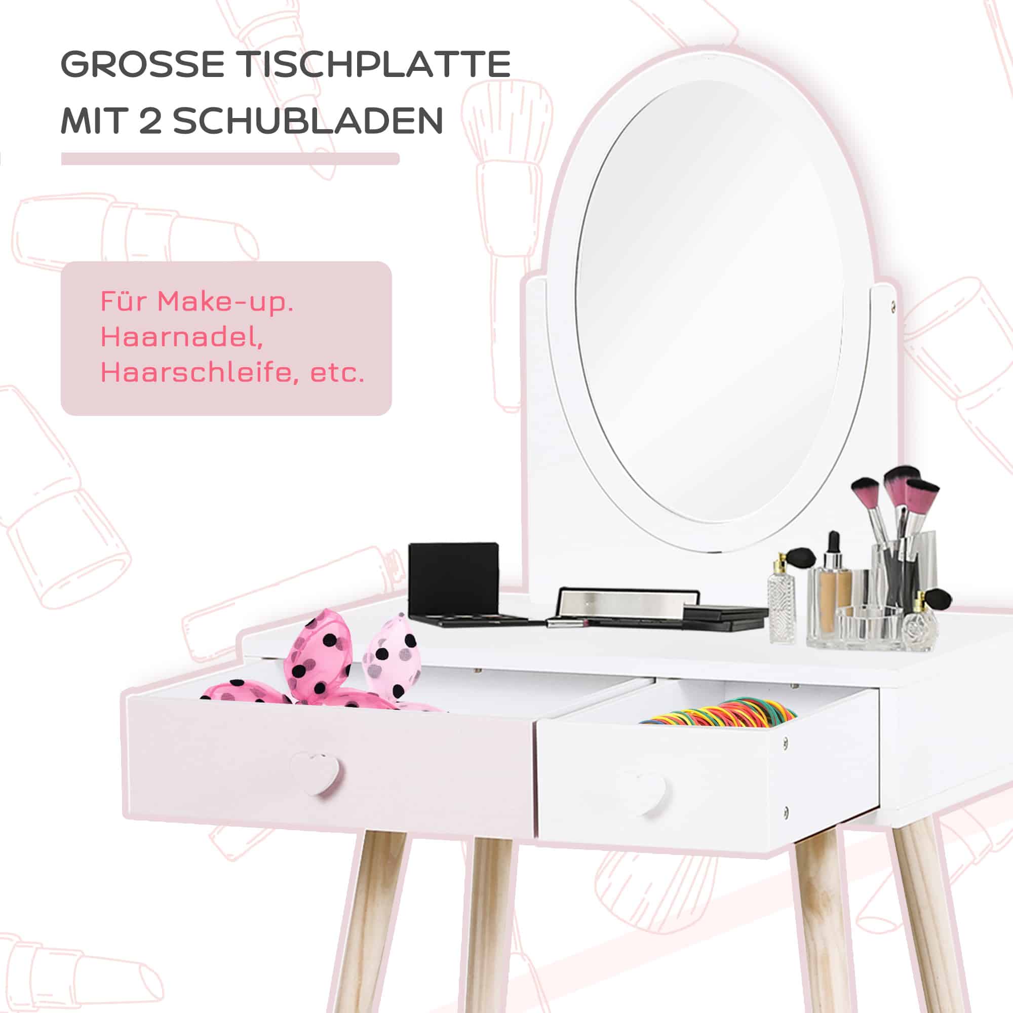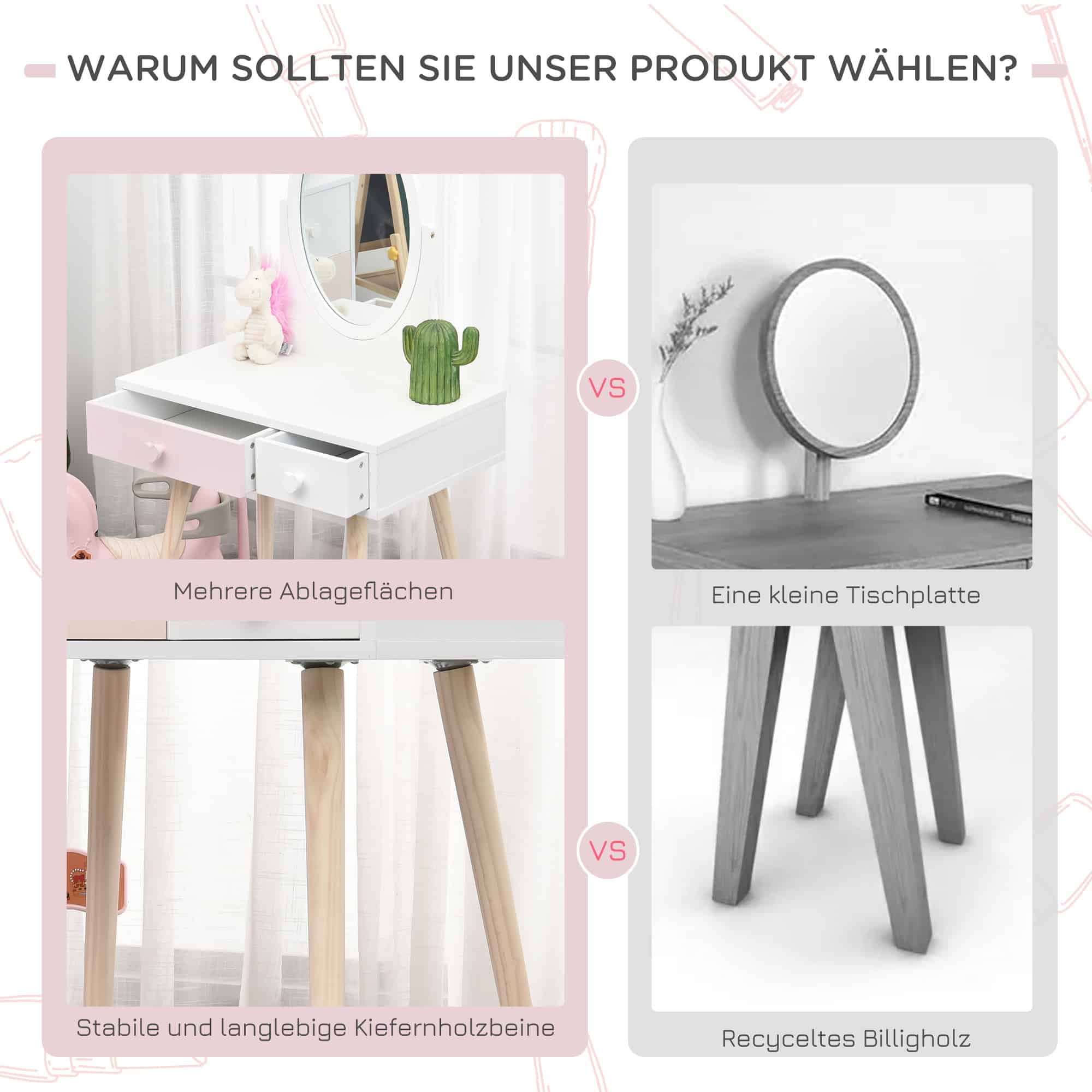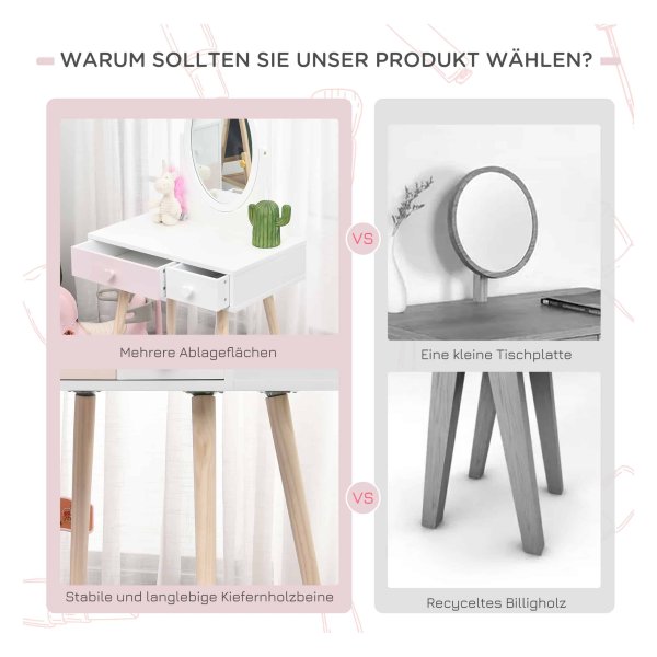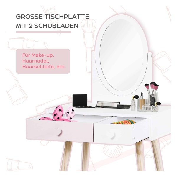 Het speelse design van deze kinderkaptafel met schattige kleuren en leuke handvatten trekt ongetwijfeld de aandacht van je kinderen. De ingebouwde spiegel en de twee lades bieden voldoende opbergruimte voor make-up, haarelastiekjes en andere accessoires. Zo kunnen je kinderen zich helemaal onderdompelen in hun eigen beauty-avonturen.