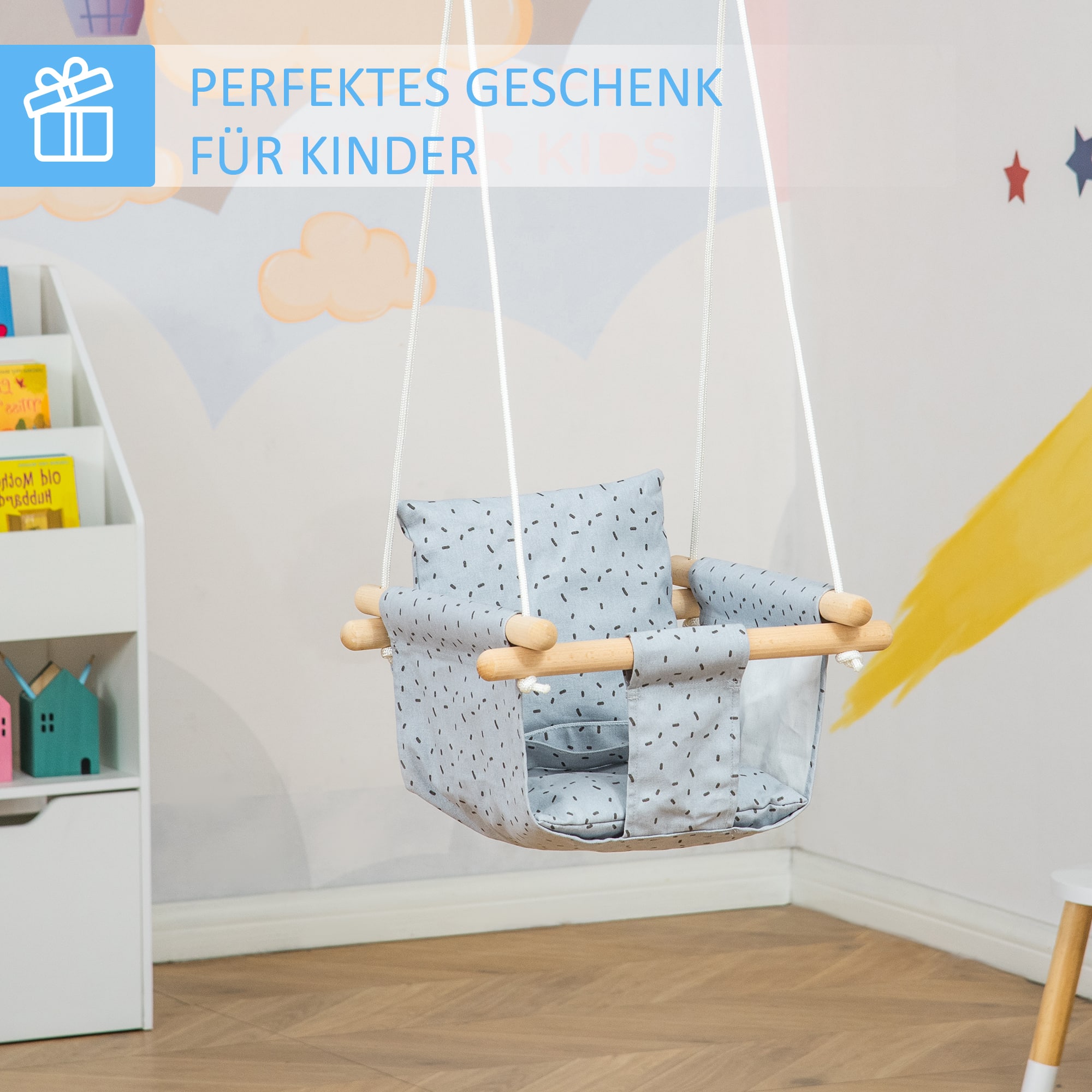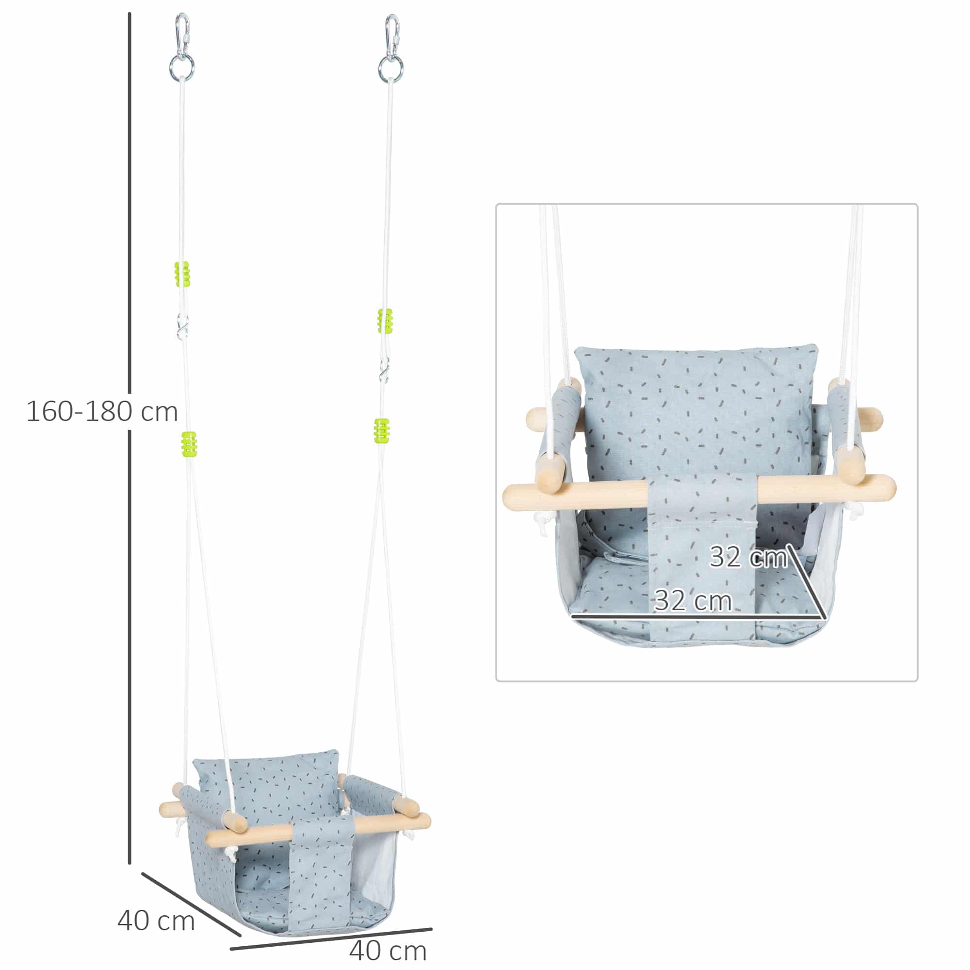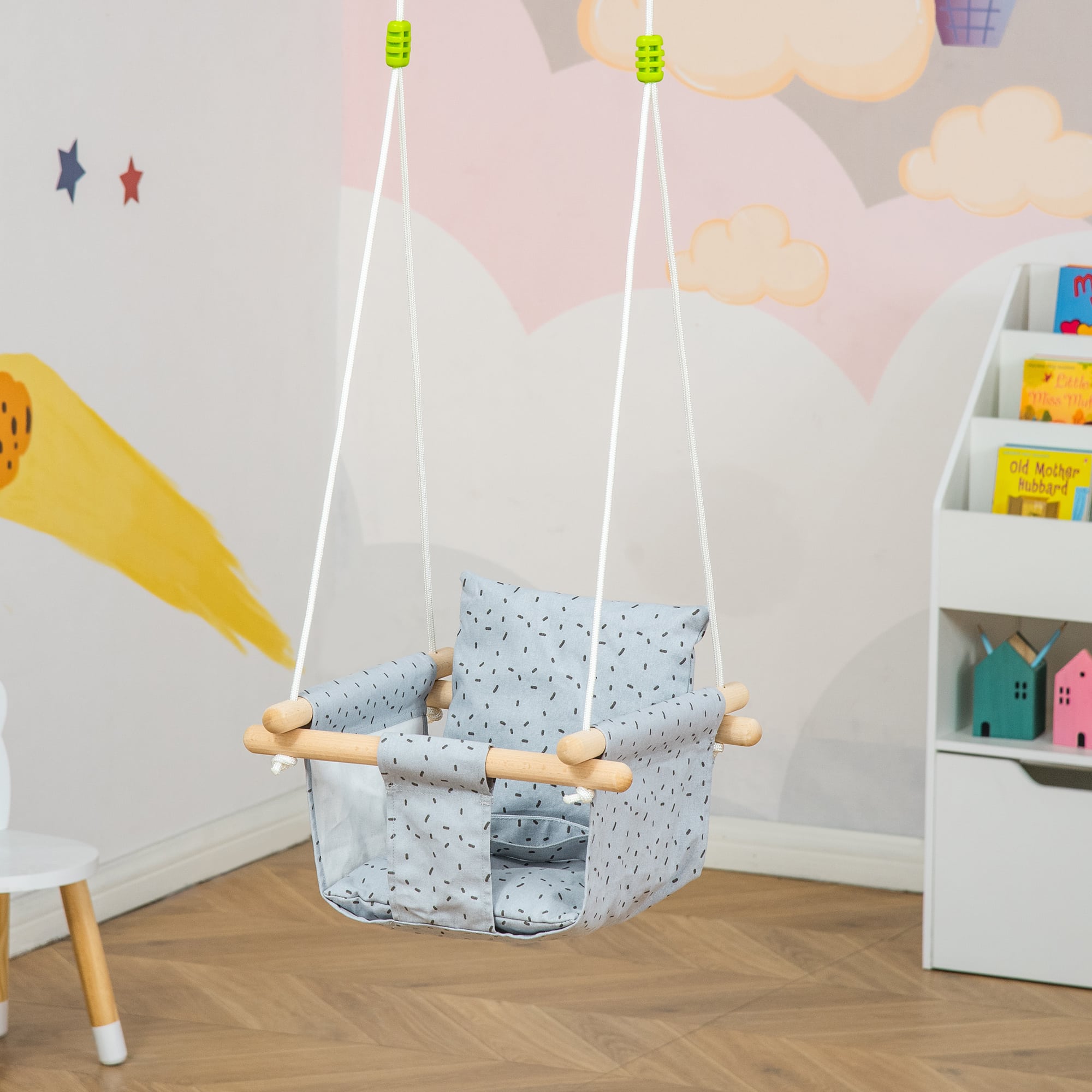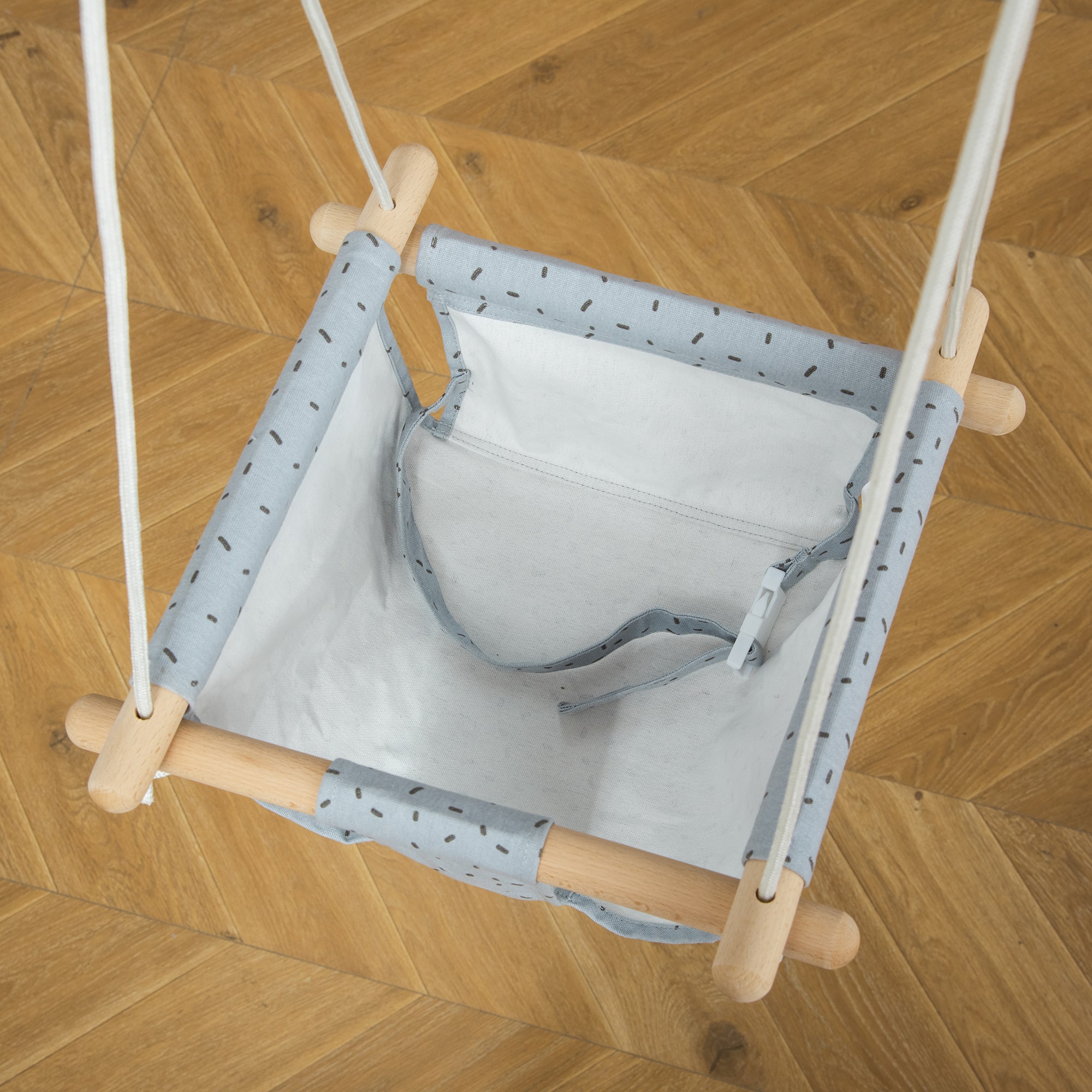 Deze kinderschommel kan eenvoudig bevestigd worden aan plafondhaken of aan bomen, waardoor hij geschikt is voor zowel binnen als buiten. Met een maximaal draagvermogen van 80 kg is de schommel geschikt voor kinderen tussen 6 maanden en 3 jaar.