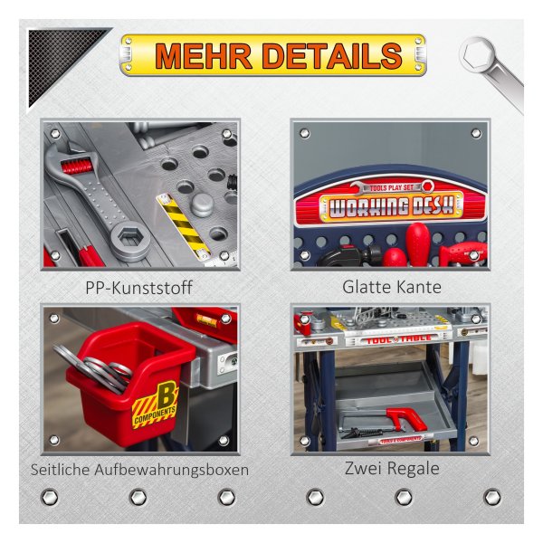De kindergereedschapsbank is ontworpen als een realistische werkbank, maar met een hoogte en stijl die meer geschikt is voor kinderen van 3-6 jaar. Het heeft 2 planken met 2 opbergdozen aan de zijkant om gereedschap op te hangen en op te bergen. Het gecertificeerde kunststof met afgeronde randen zorgt voor een veilige speelervaring voor kinderen.