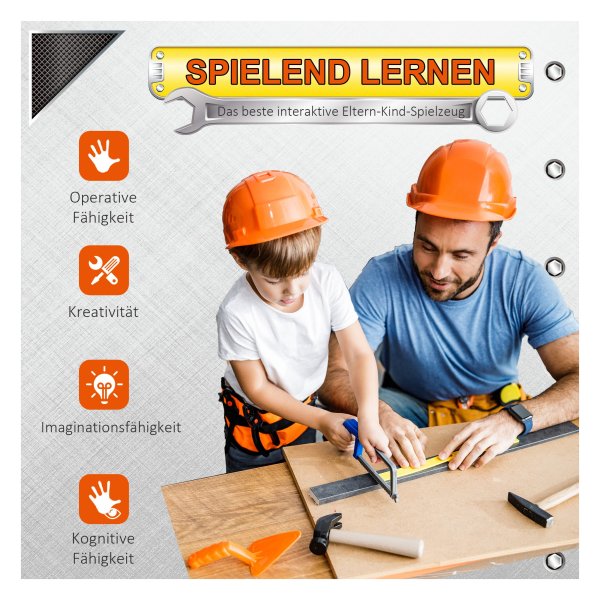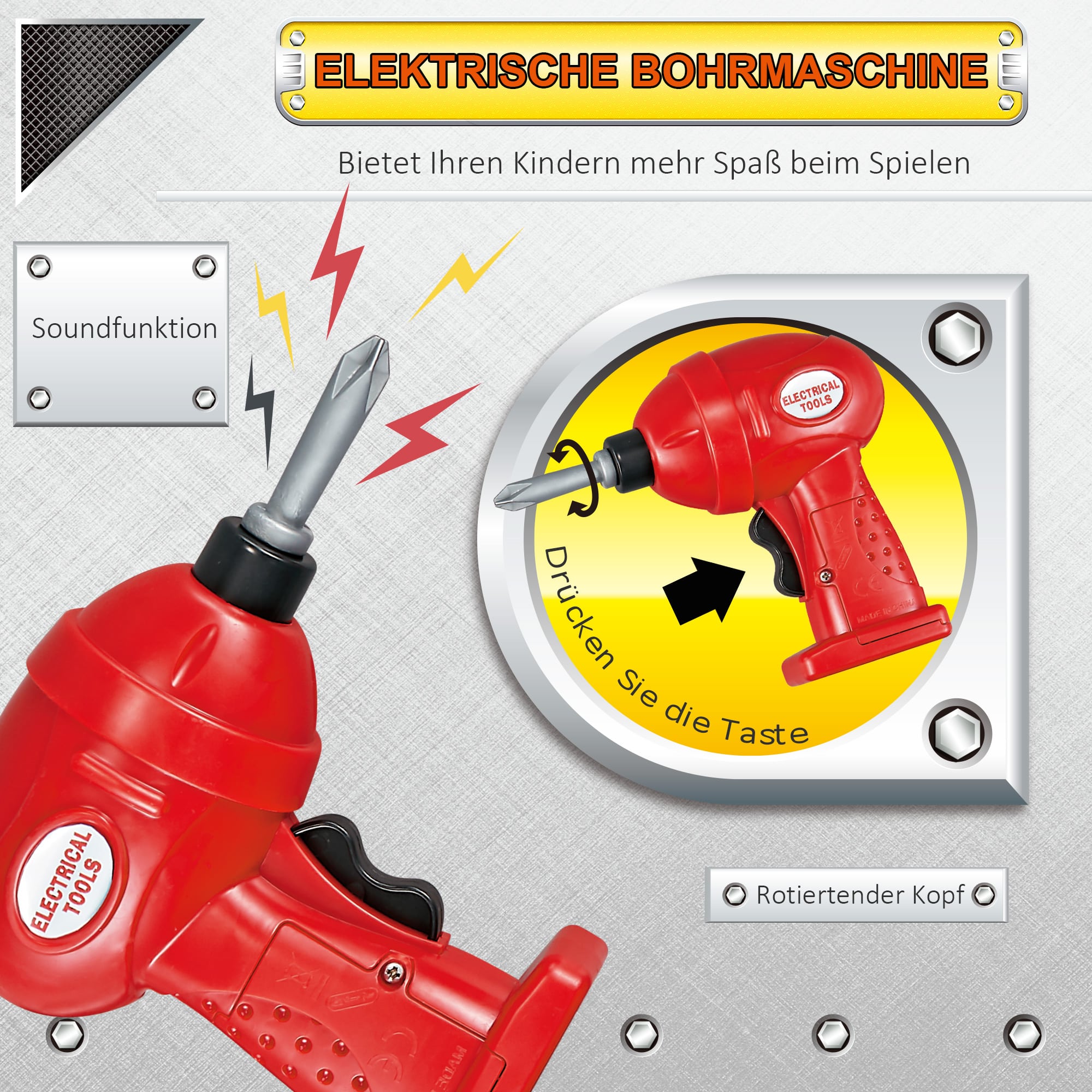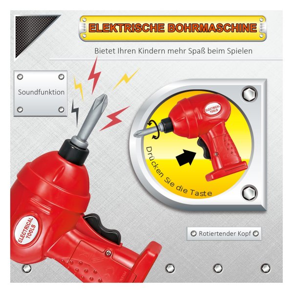 De set bevat een realistische elektrische boormachine die daadwerkelijk kan draaien en gebruikt kan worden om schroeven vast te draaien wanneer er op de knop wordt gedrukt. De lage draaisnelheid zorgt voor extra veiligheid. Door middel van rollenspel leren kinderen op een educatieve manier over gereedschappen en het gebruik ervan.