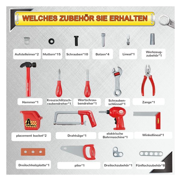 - 55 essentiële speelgoedgereedschappen inbegrepen