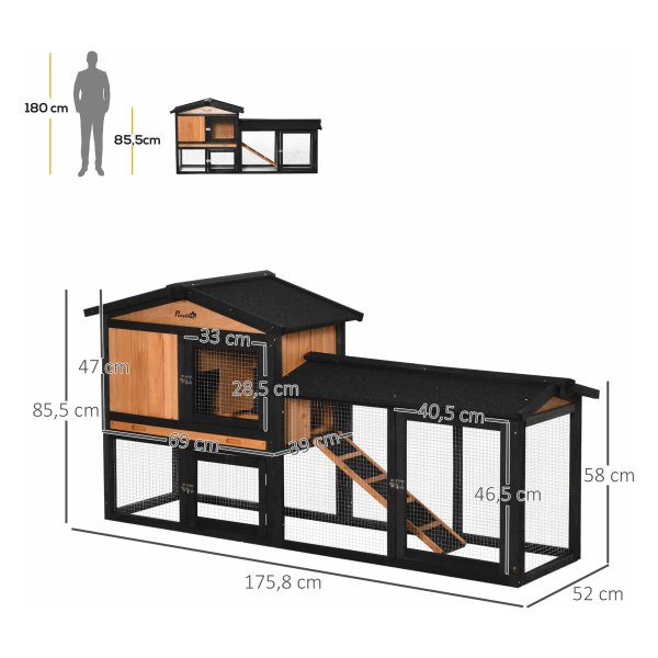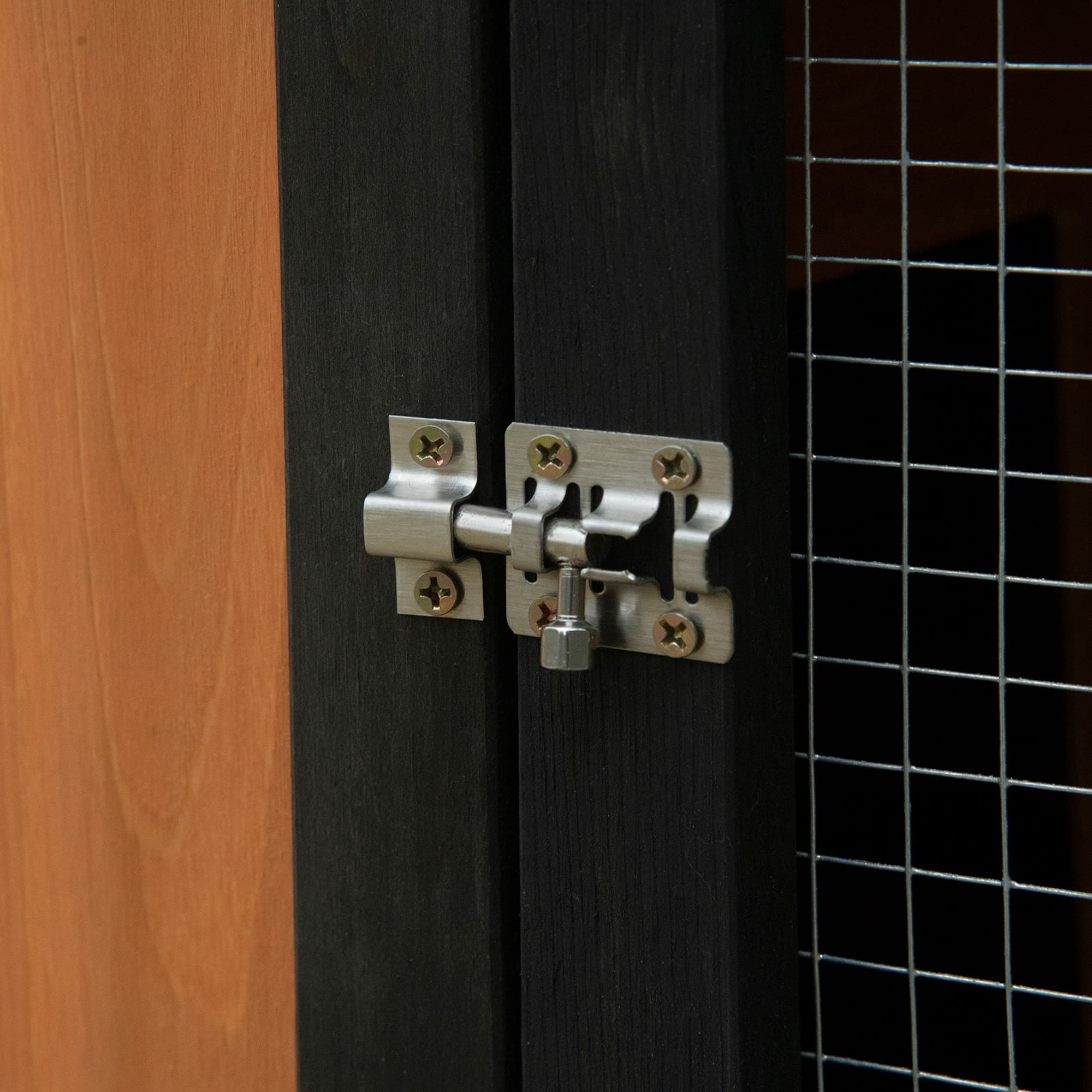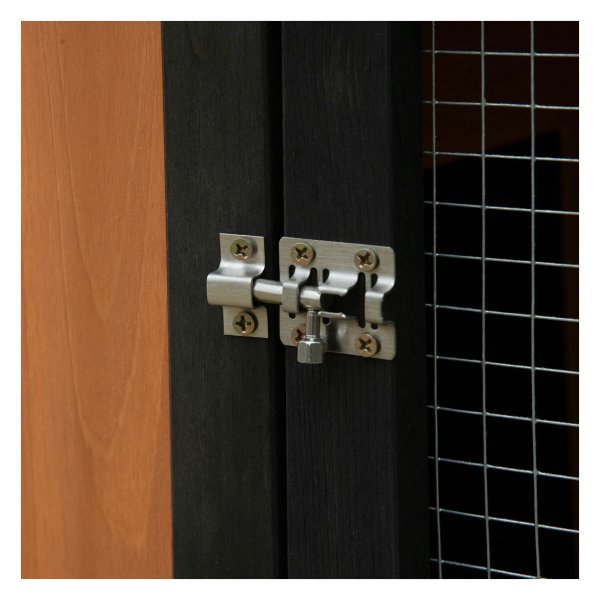 Montage van de dierenstal is vereist, maar met de duidelijke instructies is dit snel en eenvoudig te doen. De zwarte kleur met oranje accenten geeft de stal een moderne uitstraling die in elke tuin past.