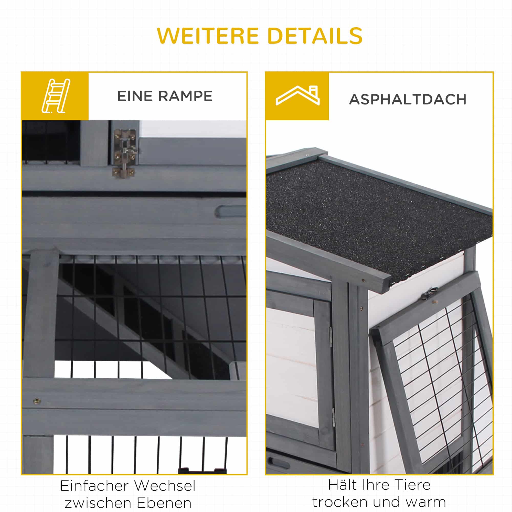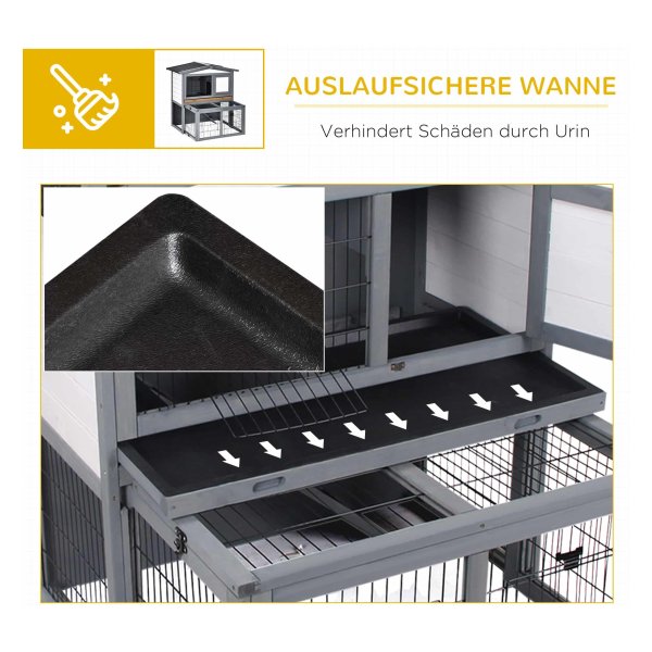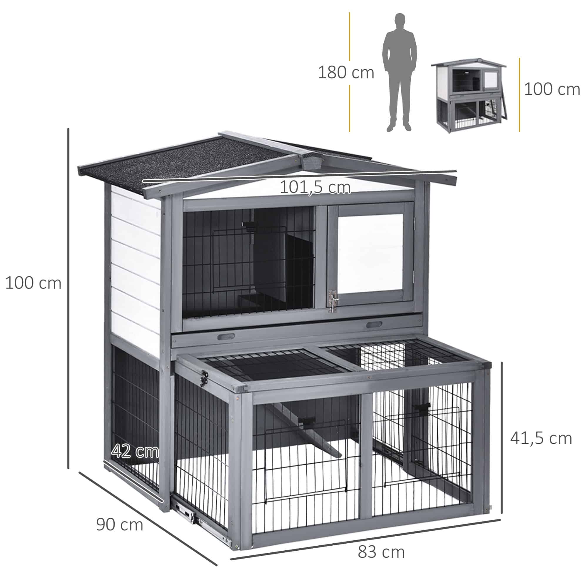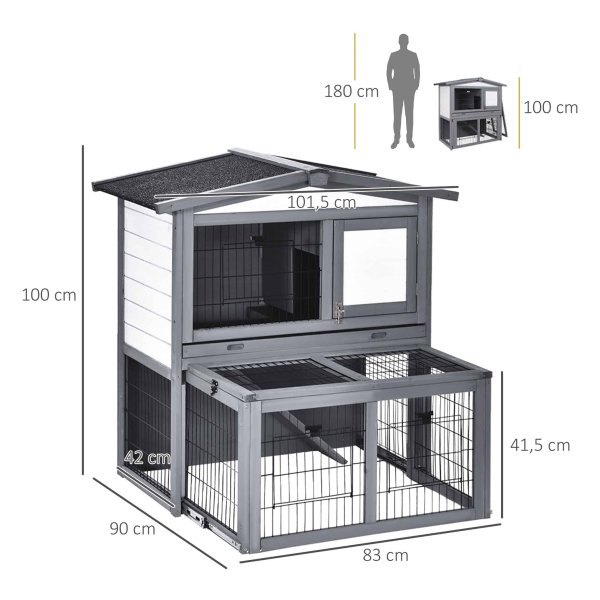 Het dierenhuis is uitgevoerd in een stijlvolle grijze kleur en is gemaakt van hoogwaardig materiaal, waaronder metalen elementen voor stabiliteit en duurzaamheid. De totale afmetingen zijn 101.5L x 90B x 100H CM, met een ruim hoofdgebouw van 83L x 42B x 39.5H CM. De deur heeft een afmeting van 29.5L x 29.5B cm voor eenvoudige toegang, terwijl de playpen een grootte heeft van 83L x 42B x 45H CM voor extra speelruimte.