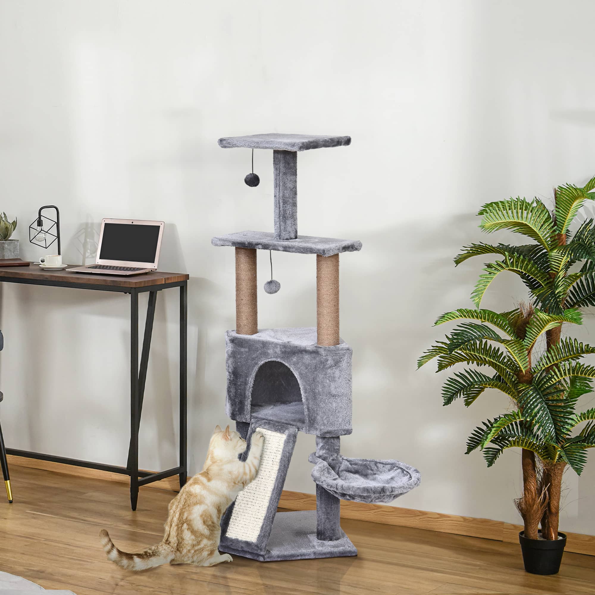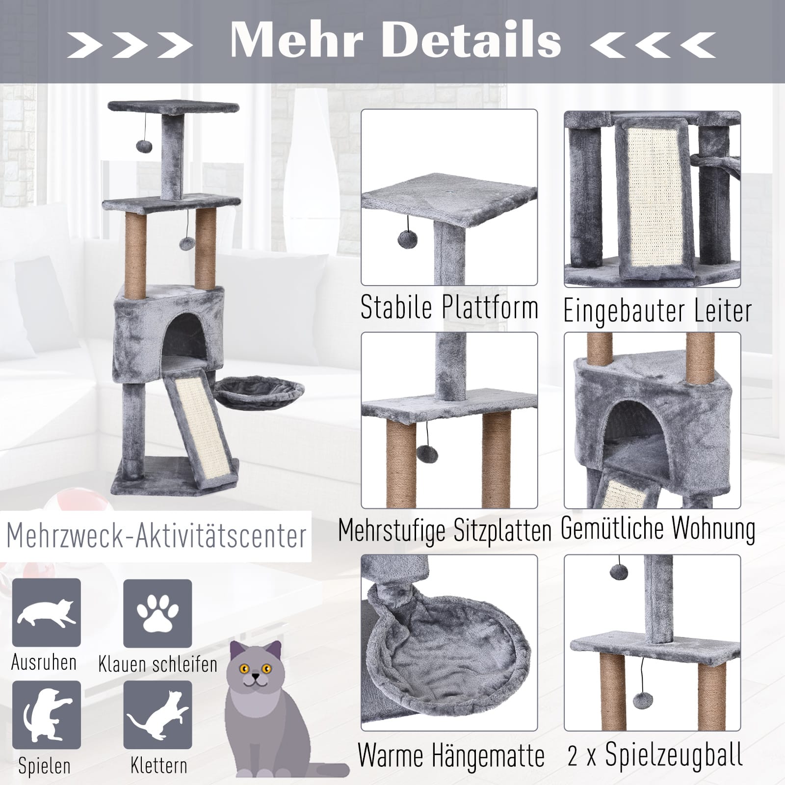 De kattengrot in grijs is de ideale toevoeging aan het interieur van jouw huis waar jouw kat zich helemaal kan uitleven. Door de diverse functies en het hoogwaardige materiaal zal jouw kat urenlang plezier hebben en zich tegelijkertijd kunnen terugtrekken in zijn eigen veilige haven.