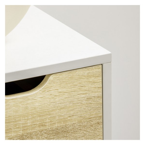 Op het ruime tafelblad van de ladenkast kunt u uw favoriete lampen, foto’s en woningdecoraties tentoonstellen, waardoor u uw persoonlijke stijl kunt laten zien. Daarnaast is deze kast voorzien van een kantelbescherming die aan de achterkant kan worden bevestigd voor extra veiligheid.