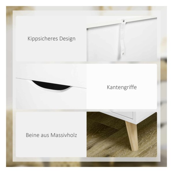 De elegante handgrepen zorgen voor een comfortabele ervaring bij het openen en sluiten van de lades. Bovendien is het robuuste houten frame voorzien van een veilige kantelbescherming, waardoor het perfect is voor gezinnen met kleine kinderen of huisdieren.
