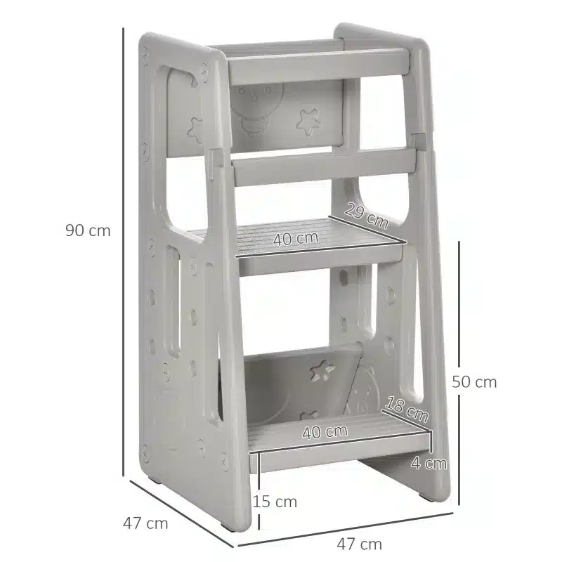 Met een kleurrijke grijze afwerking past deze leertoren perfect in elke kinderkamer of speelhoek. Het materiaal van de leertoren is HDPE, waardoor het duurzaam en veilig is voor dagelijks gebruik. De totale afmetingen van de leertoren zijn 47 cm lang, 47 cm breed en 90 cm hoog.