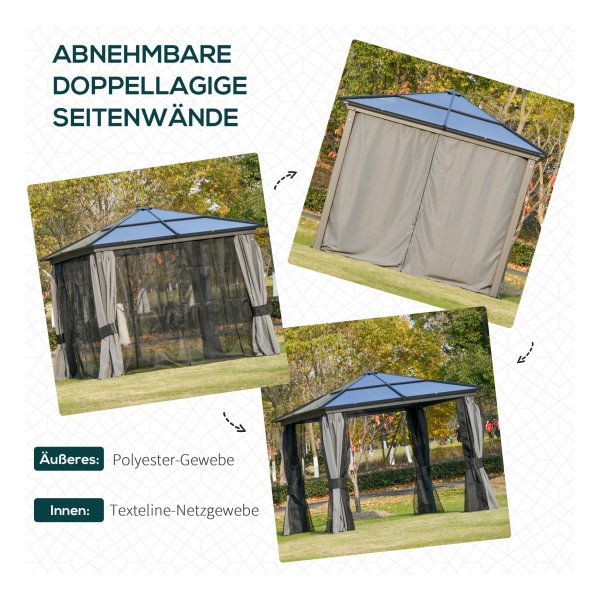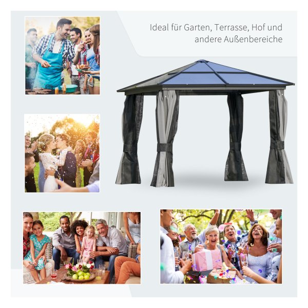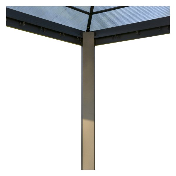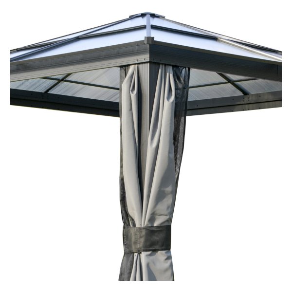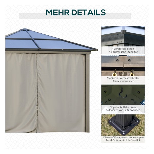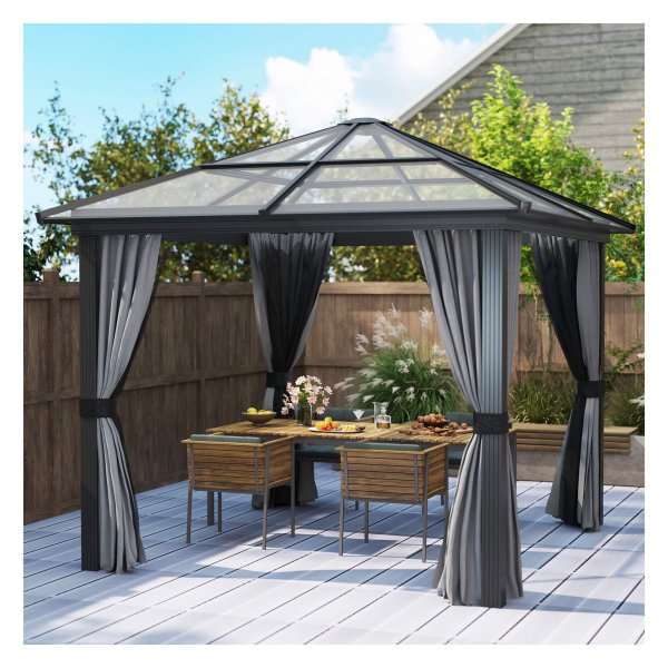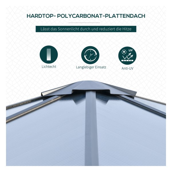 Het tuinpaviljoen is voorzien van een lichtdoorlatend dak gemaakt van UV-bestendig materiaal, waardoor je kunt genieten van het buitenleven zonder je zorgen te maken over schadelijke stralen. Het frame is gemaakt van gepoedercoat aluminium, wat zorgt voor een hoge kwaliteit en lange levensduur.