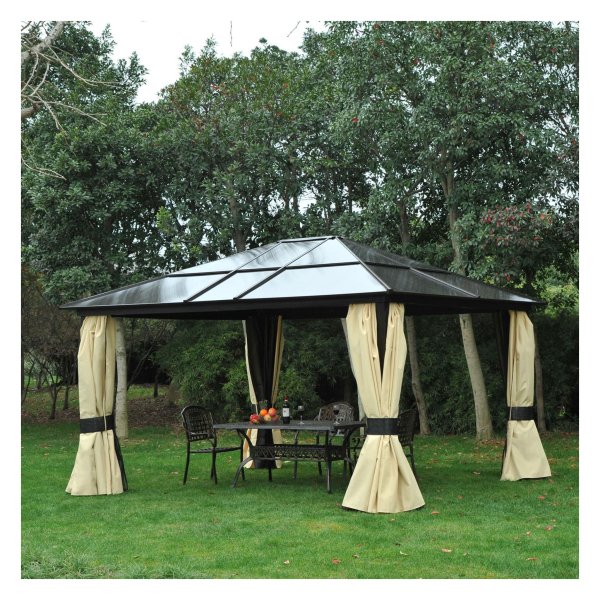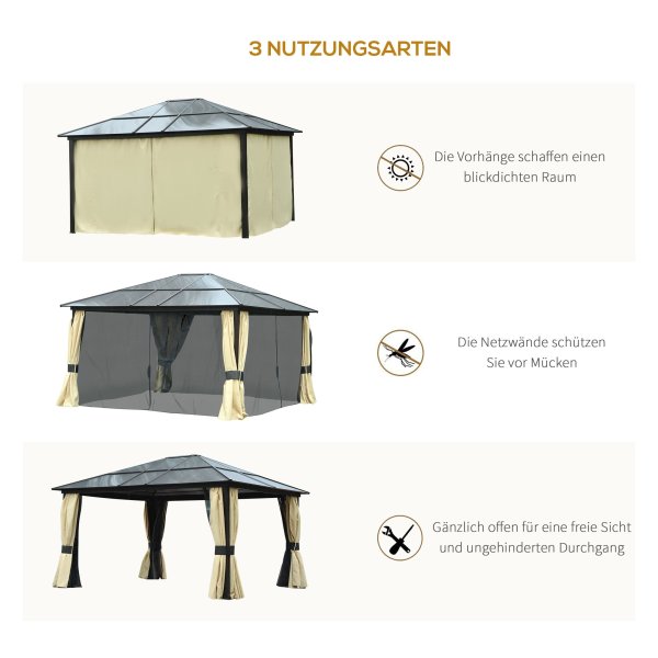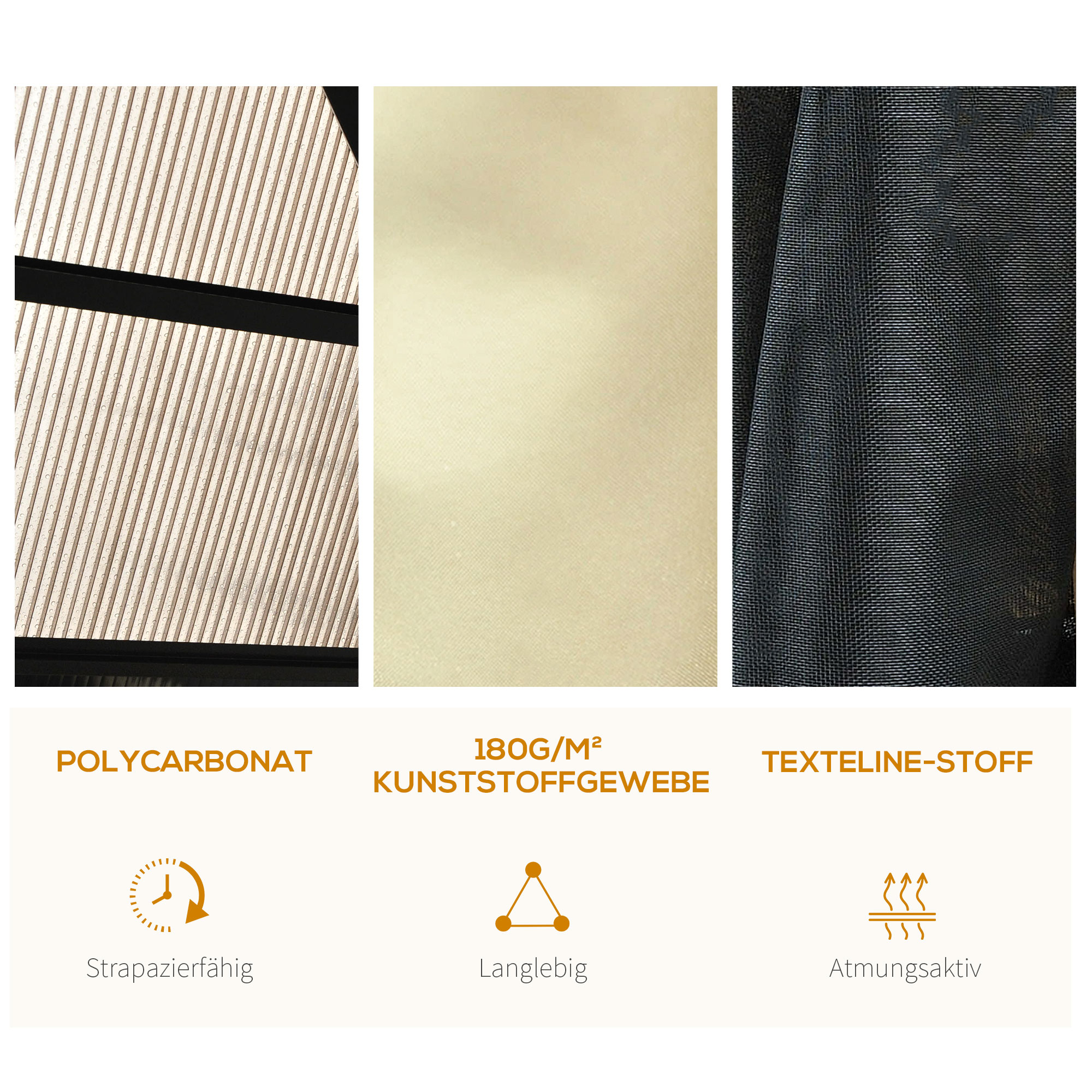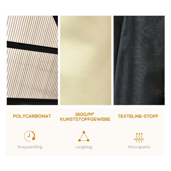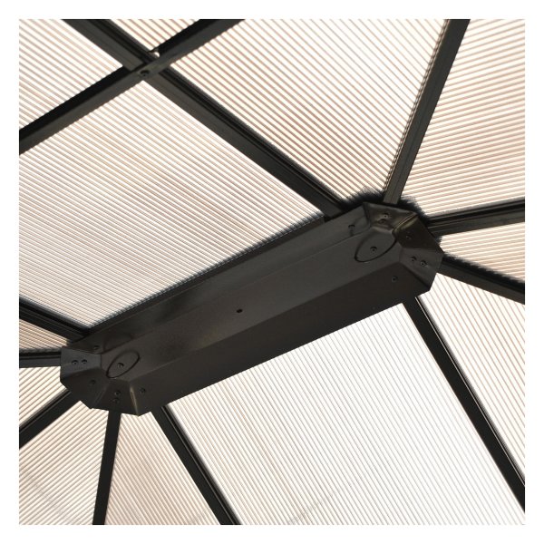 Het lichtdoorlatende dak van ons tuinpaviljoen is vervaardigd van hoogwaardig polycarbonaat, waardoor een gezellige en uitnodigende sfeer ontstaat om te relaxen. Dit materiaal is UV-resistent en waterdicht, waardoor het dak bestand is tegen diverse weersomstandigheden en langdurig gebruik.