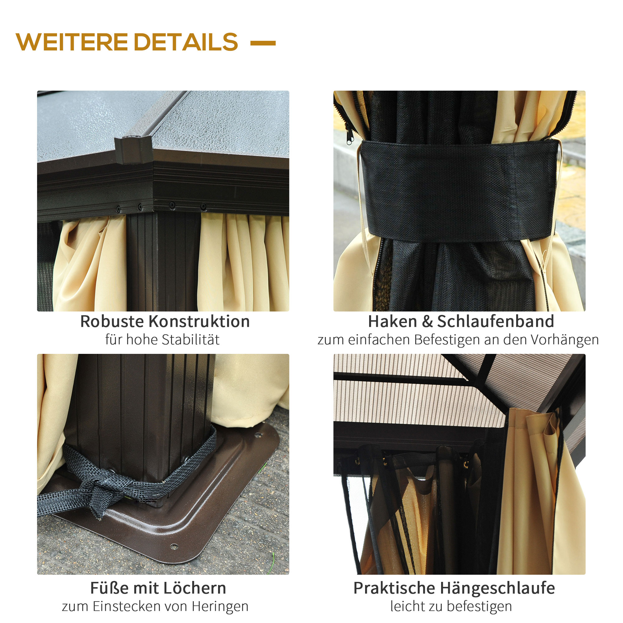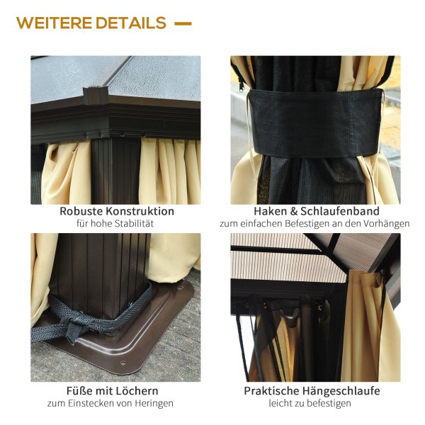 Dit tuinpaviljoen wordt geleverd met dubbele lagen gordijnen, waardoor je beschermd bent tegen ongewenste weersomstandigheden en insecten. Deze gordijnen kunnen eenvoudig worden gesloten of verwijderd, zodat je zelf de mate van beschutting kunt bepalen.