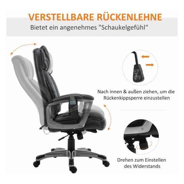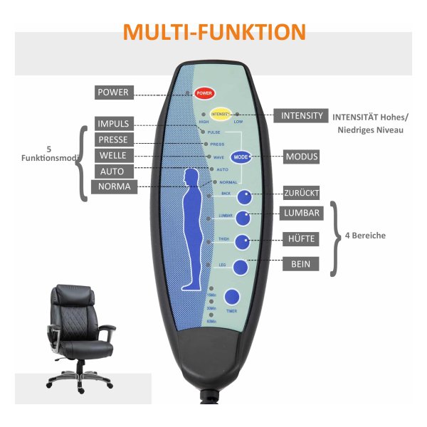 Deze massagestoel heeft 6 massagepunten, waarvan 4 in de rugleuning en 2 in de zitting. Met 5 verschillende functiemodi, waaronder puls, kneden, strekken, automatisch en normaal, kun je de massage aanpassen aan jouw behoeften en voorkeuren.