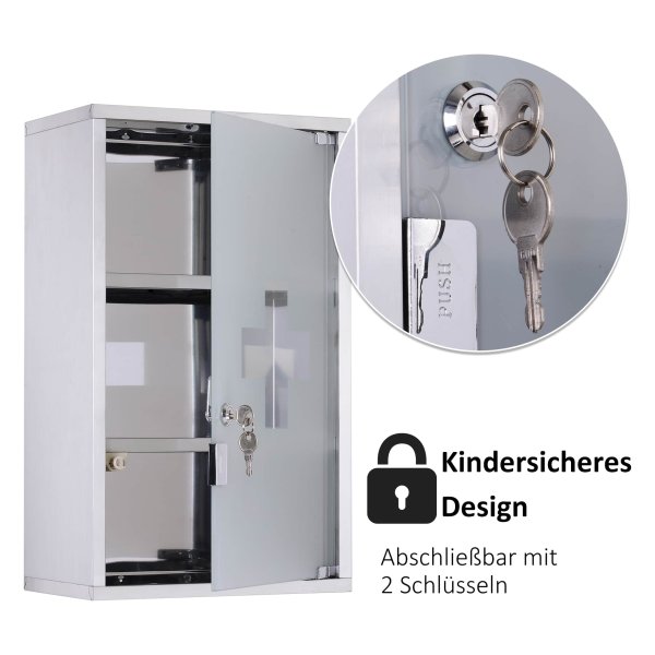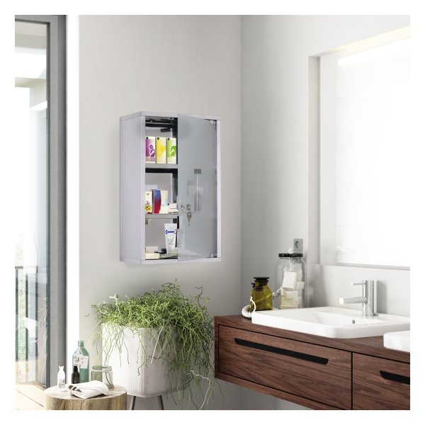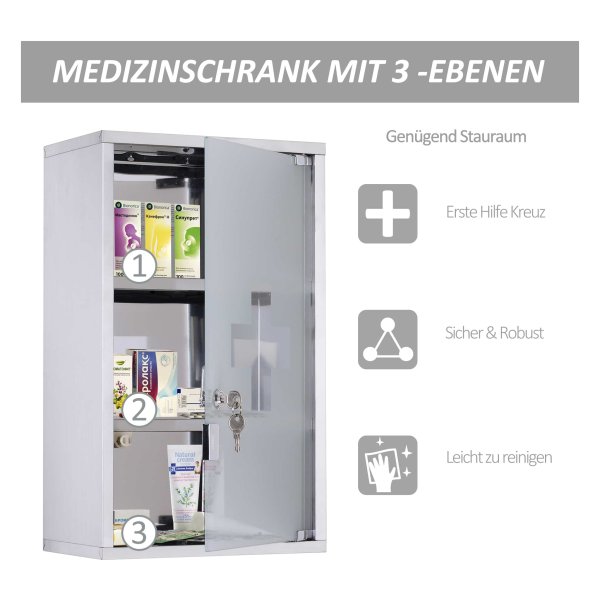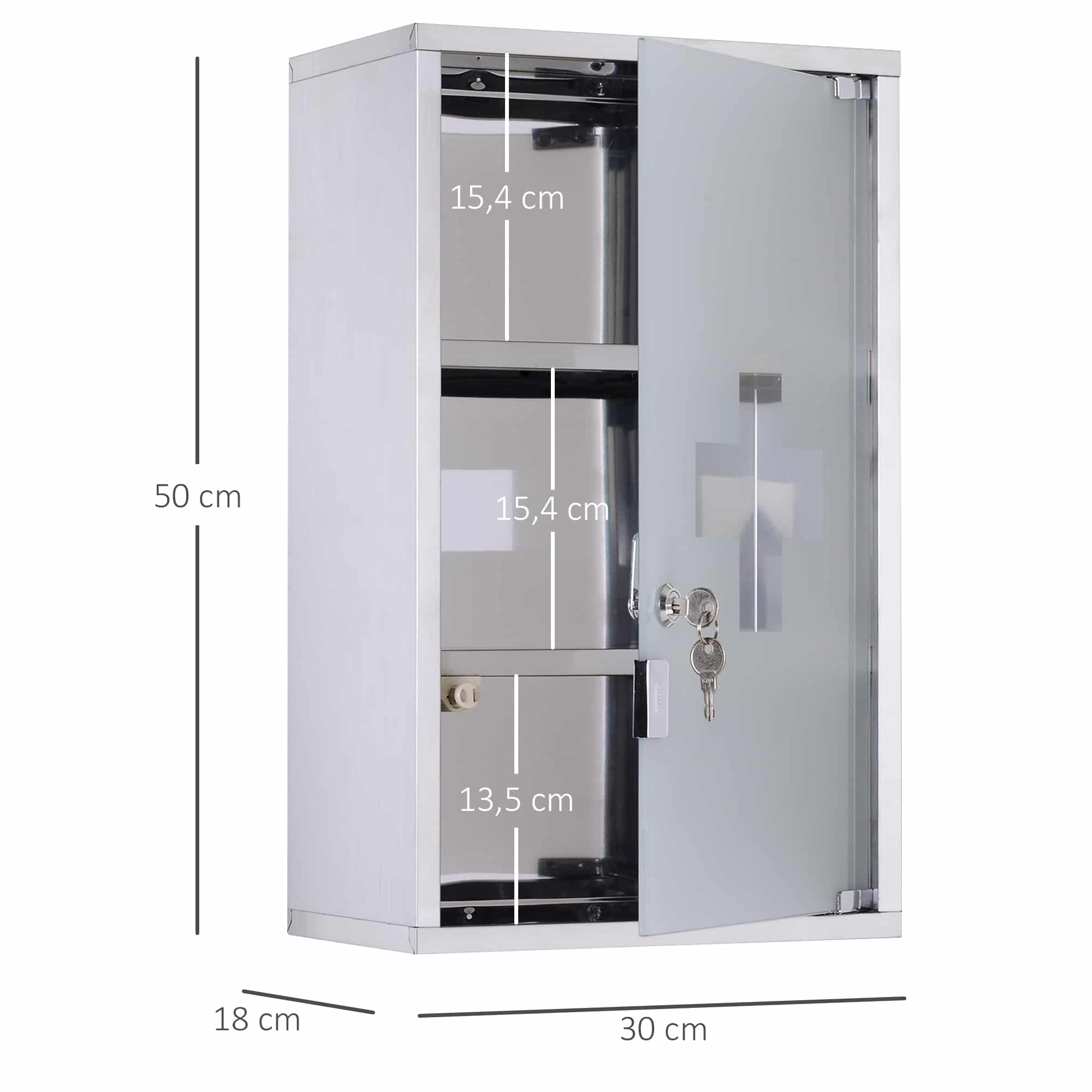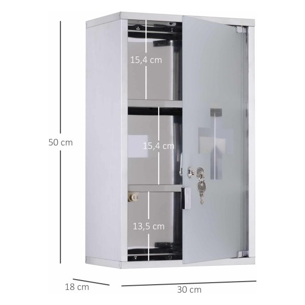 De Medicijnkast is eenvoudig te monteren, zelfs zonder speciale vaardigheden, dankzij het handige ontwerp. Met de afmetingen van B30 x T18 x H50 cm biedt deze kast voldoende opbergruimte voor al uw medicijnen. De deur heeft een afmeting van B26.5 x H46.2 cm en een glasdikte van 5 mm, en kan een gewicht tot 5 kg dragen.
