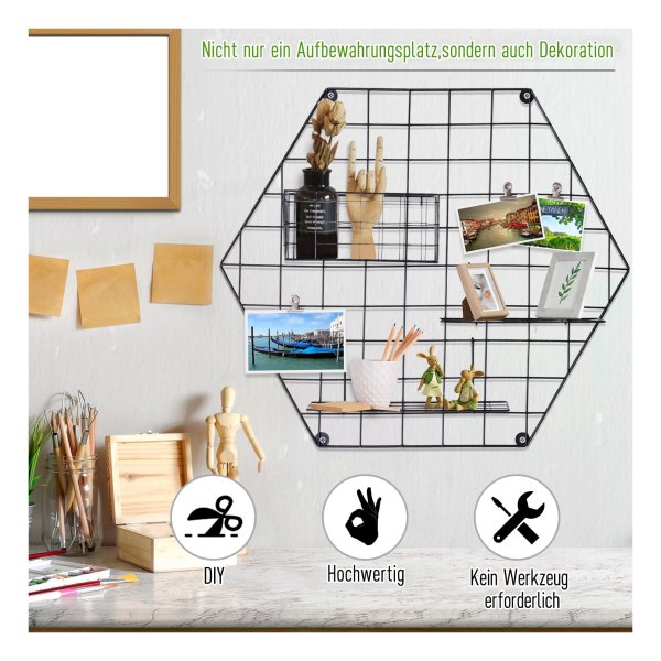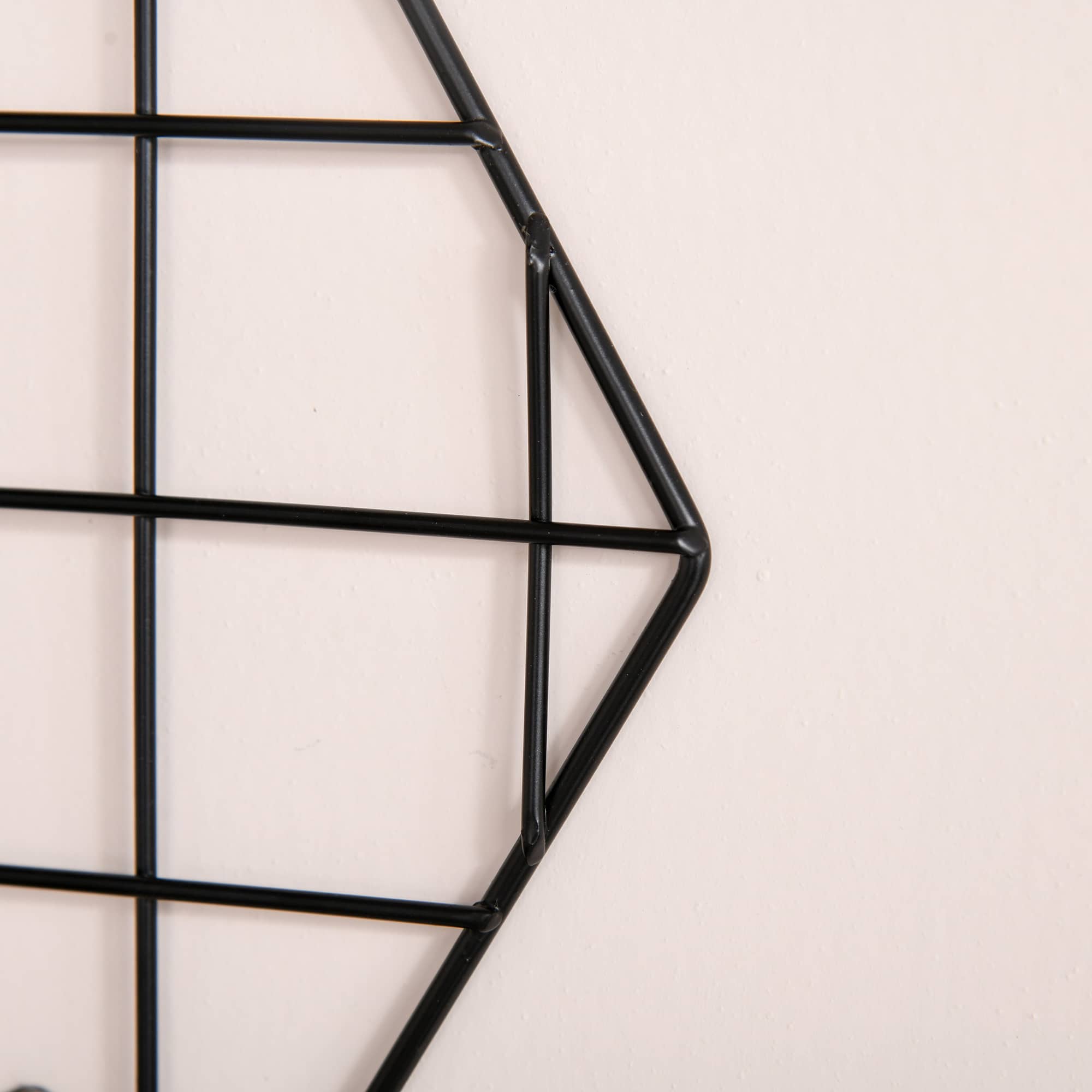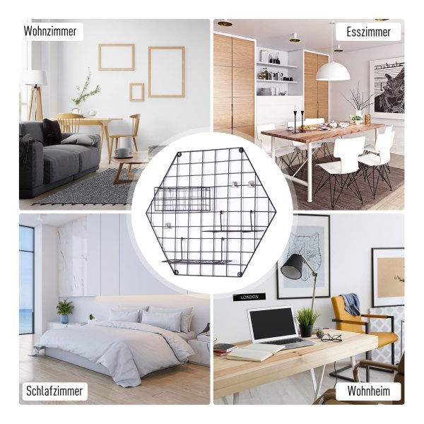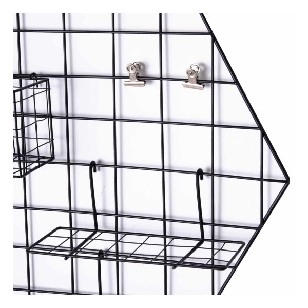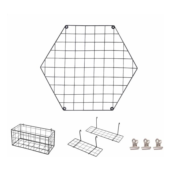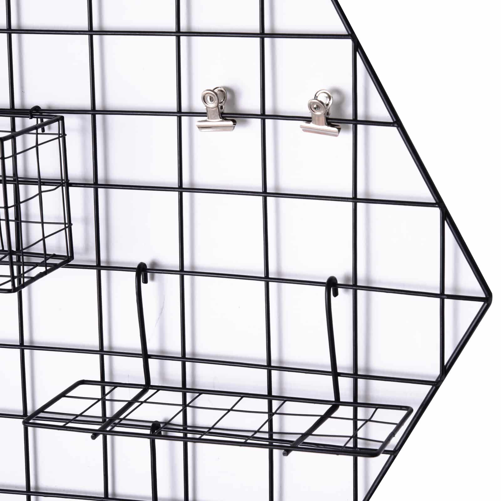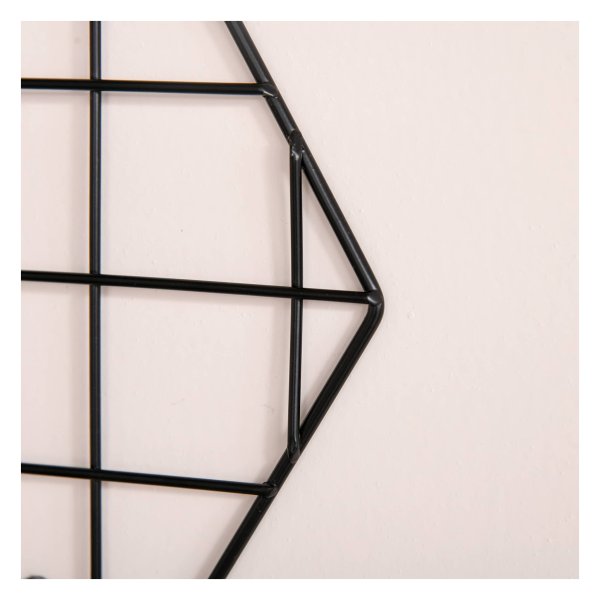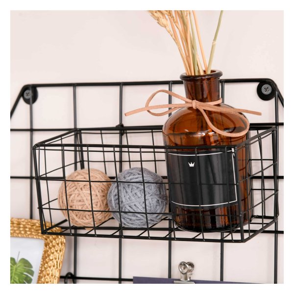 Kortom, dit muurrooster is de ideale oplossing voor iedereen die op zoek is naar een praktische en decoratieve manier om hun ruimte op te fleuren. Met de stevige constructie en de zwarte coating bent u verzekerd van een product dat jarenlang meegaat en uw ruimte een persoonlijke touch geeft. Bestel vandaag nog dit muurrooster en transformeer uw kamer in een stijlvolle en georganiseerde ruimte.