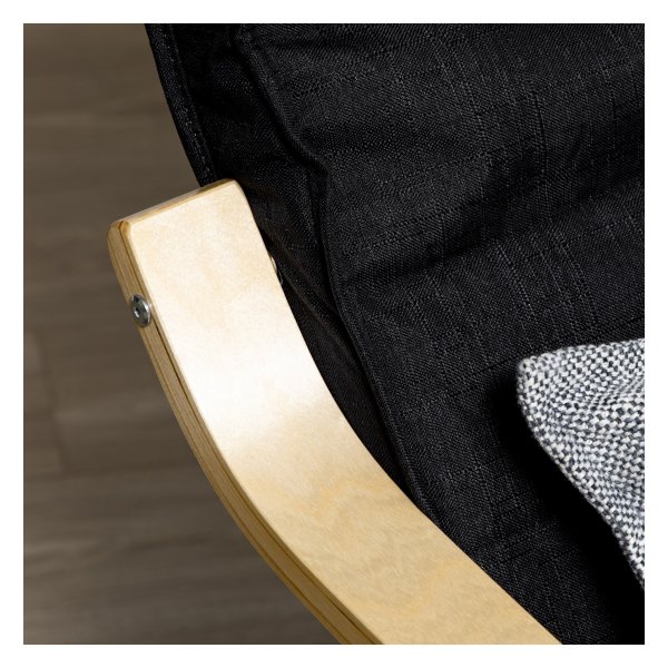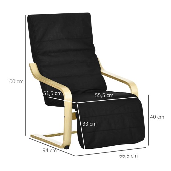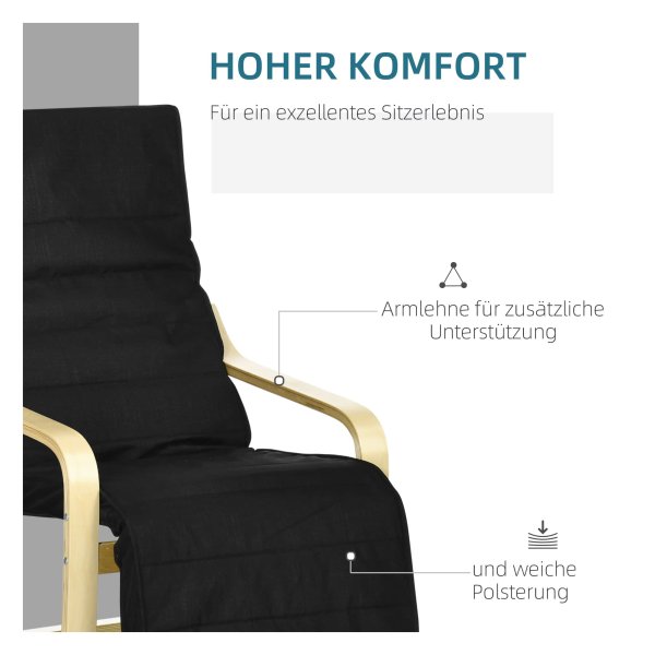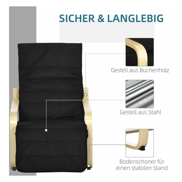 Met de verstelbare beensteun kunt u de positie van de schommelstoel naar wens aanpassen, zodat u kunt genieten van een ontspannend moment met een kopje thee, een goed boek of een rustgevende film. Het elegante houten frame in combinatie met de zwarte linnen look bekleding zorgt voor een verfijnde uitstraling in elke ruimte.