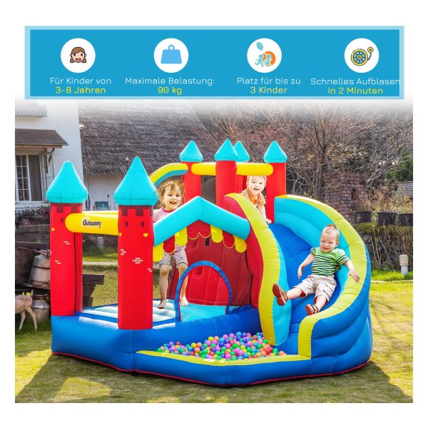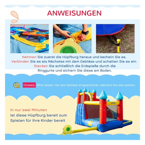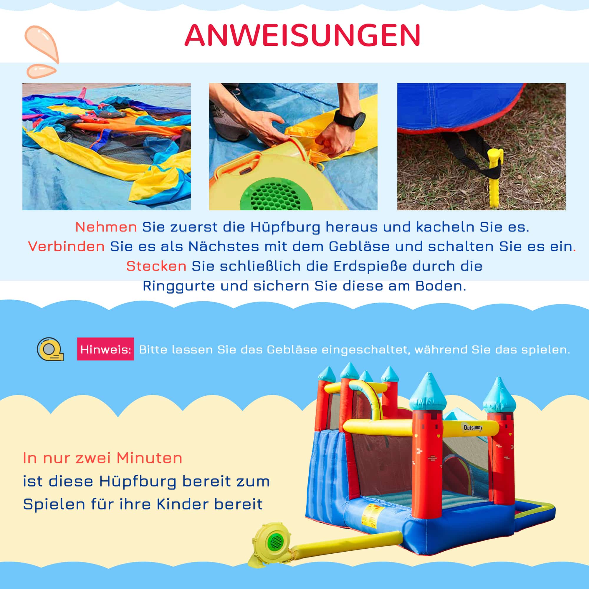 Dankzij de hoogwaardige elektrische luchtblazer die wordt meegeleverd, kan de hele speelset in slechts 2 minuten worden opgeblazen. Zo bespaar je kostbare tijd en kunnen de kinderen snel aan het spelen beginnen.