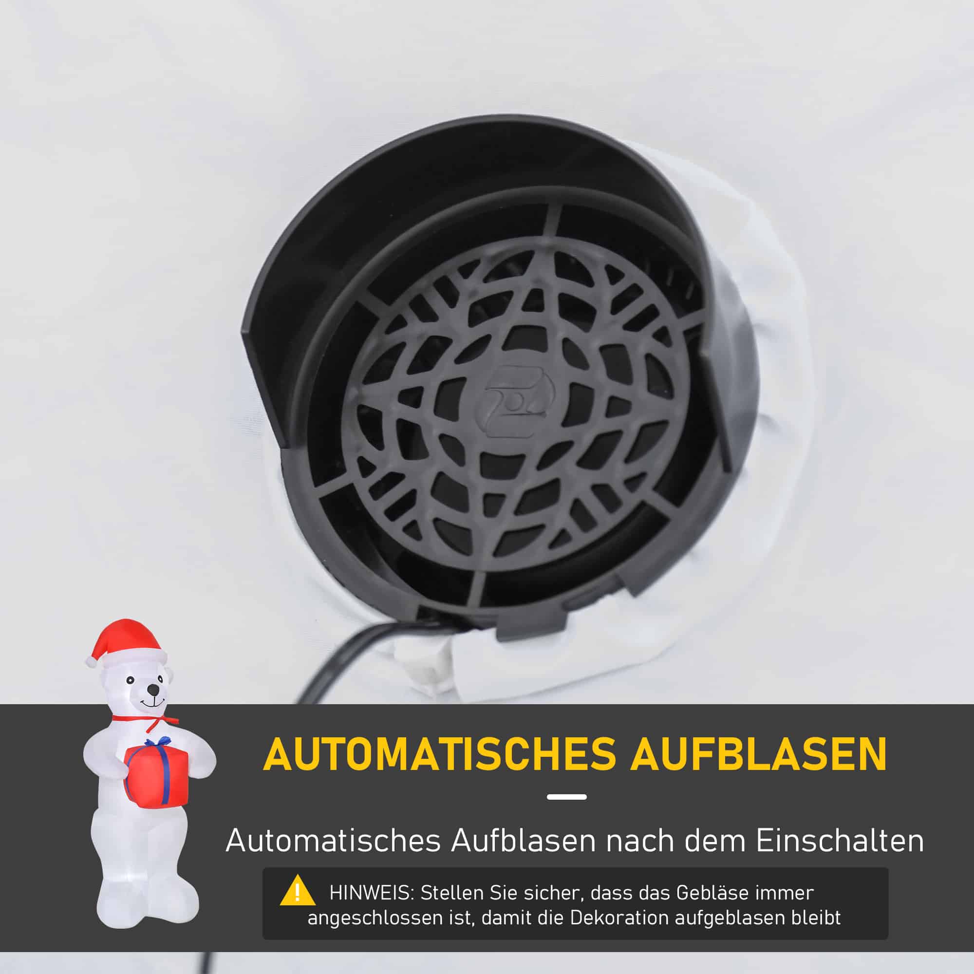 Met een automatische inflatie bij inschakeling is de opblaasbare ijsbeer eenvoudig op te zetten. De bijgeleverde 5 haringen, 2 treinbanden en 3 zandzakken zorgen voor stabiliteit en een stevige stand, zodat je je geen zorgen hoeft te maken over omwaaien. De ijsbeer is gemaakt van weerbestendig polyester en is geschikt voor zowel binnen als buiten gebruik.