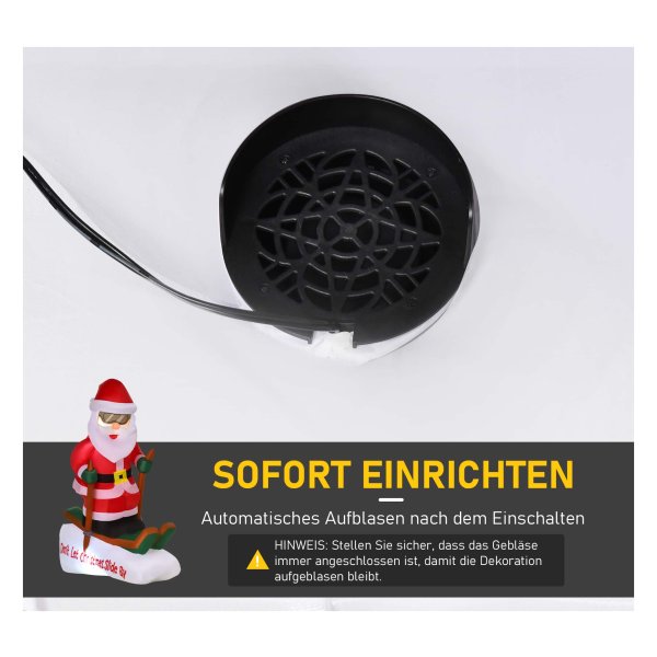 Dankzij de certificering en specificaties van deze kerstman slee ben je verzekerd van een veilig en duurzaam product. De interne ventilator zorgt ervoor dat de kerstman te allen tijde opgeblazen blijft, waardoor je niet constant de kerstman hoeft op te pompen.