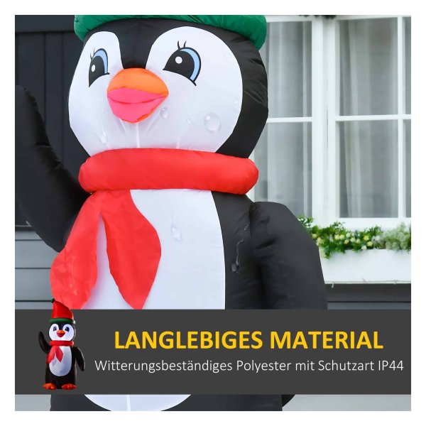 De opblaasbare pinguïn is gemaakt van waterdichte polyester stof met een IP44-certificering, waardoor hij bestand is tegen regen en vocht. Hierdoor is de decoratie niet alleen geschikt voor buiten, maar ook voor gebruik binnenshuis.