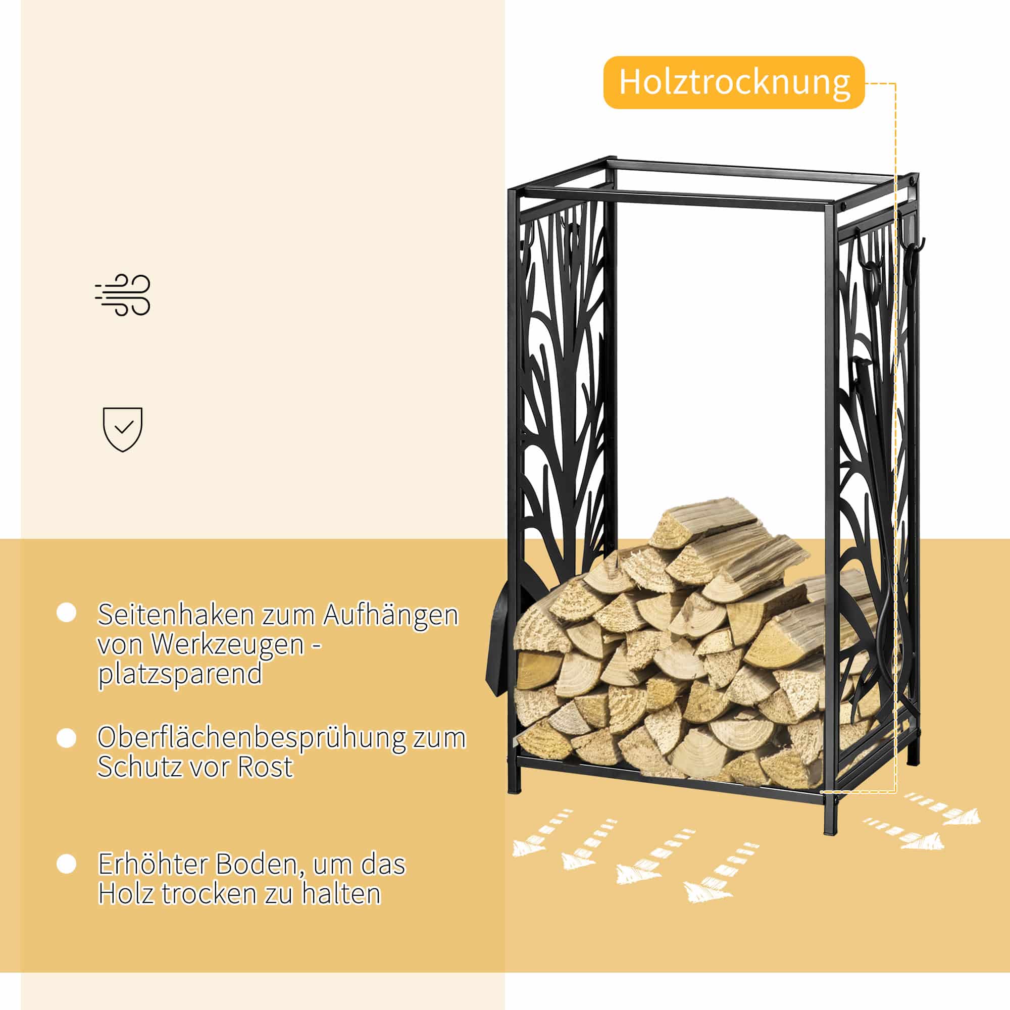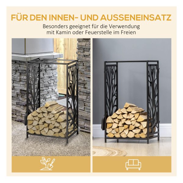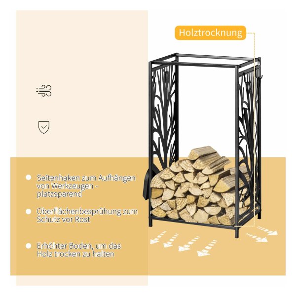 Het ontwerp van de standaard met verhoogde benen zorgt ervoor dat het hout altijd droog blijft, waardoor het gemakkelijk te gebruiken is, zelfs op regenachtige dagen. Met deze haardstandaard heeft u altijd voldoende brandhout bij de hand om uw open haard aan te steken en te genieten van de warmte en gezelligheid die het met zich meebrengt.