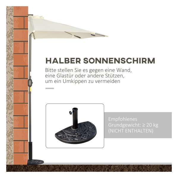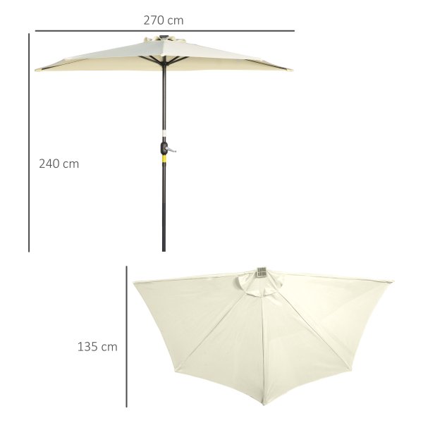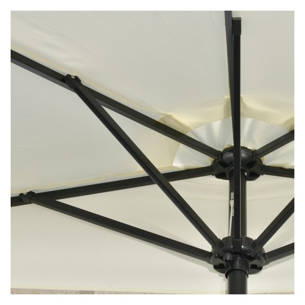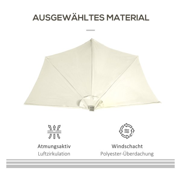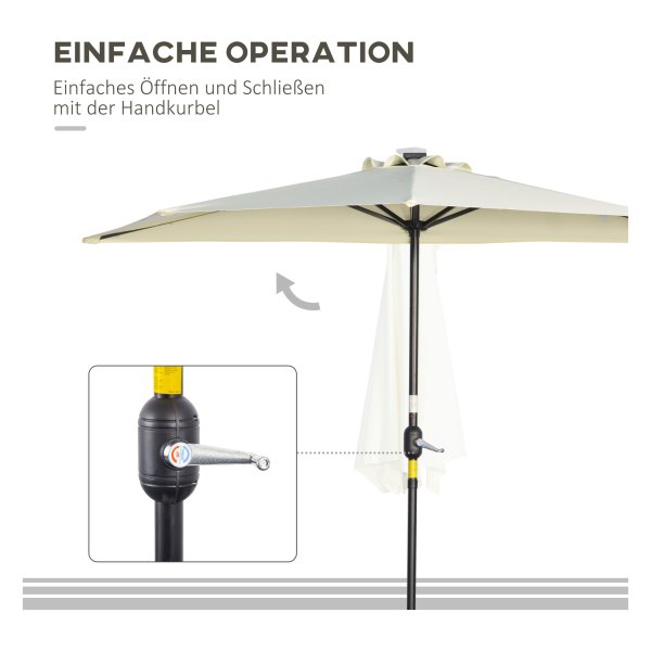 Bullet point 5 | De compacte of ruimtebesparende ontwerp van de halfscherm parasol van Outsunny is ideaal voor kleinere buitenruimtes zoals balkons en kleine terrassen. Doordat de paraplu dichtbij een muur kan worden opgesteld, neemt hij weinig ruimte in beslag en kan hij toch veel schaduw bieden en beschermen tegen direct zonlicht. Het halfronde design zorgt voor een unieke uitstraling en de mogelijkheid om een persoonlijke zomeroase te creren. Daarnaast heeft deze parasol zonne-energie aangedreven LED-verlichting, wat helpt energie te besparen. De parasol is voorzien van een handige draaikruk waarmee het dak gemakkelijk geopend en gesloten kan worden. Dankzij de stevige constructie met zes stabiliteitsstutten, 180 g/m polyester stof en een robuuste metalen mast is deze parasol ook stabiel in winderige omstandigheden. Het feit dat de parasol in twee delen kan worden opgevouwen zorgt voor eenvoudige en compacte opslag wanneer hij niet in gebruik is. Aangezien montage vereist is, wordt het product geleverd met een handleiding. |