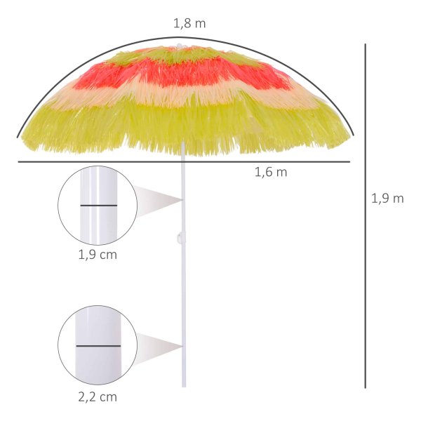 Met een diameter van 160 cm biedt dit strandscherm voldoende bescherming voor u en uw gezin tegen de zonnestralen. De levendige kleuren geven uw buitenruimte een vrolijke uitstraling, terwijl de duurzame materialen zorgen dat u lang plezier zult hebben van uw strandscherm.