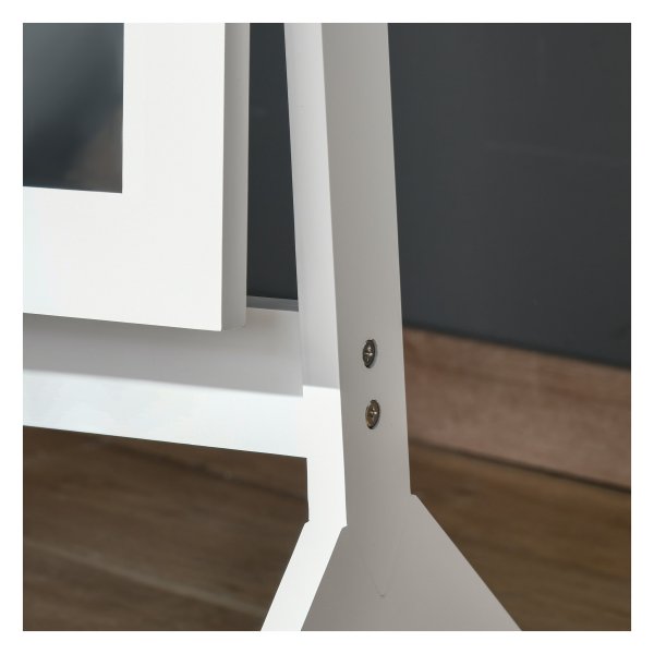 De Spiegelplanklamp is uitgevoerd in een frisse witte kleur, waardoor hij perfect past bij elke woonstijl. De afmetingen van de spiegel zijn B47 x D46 x H148 cm, met een spiegelgrootte van L118 x B42 x D1.8 cm (met frame) en L108 x B32 x D0,3 cm (zonder frame).