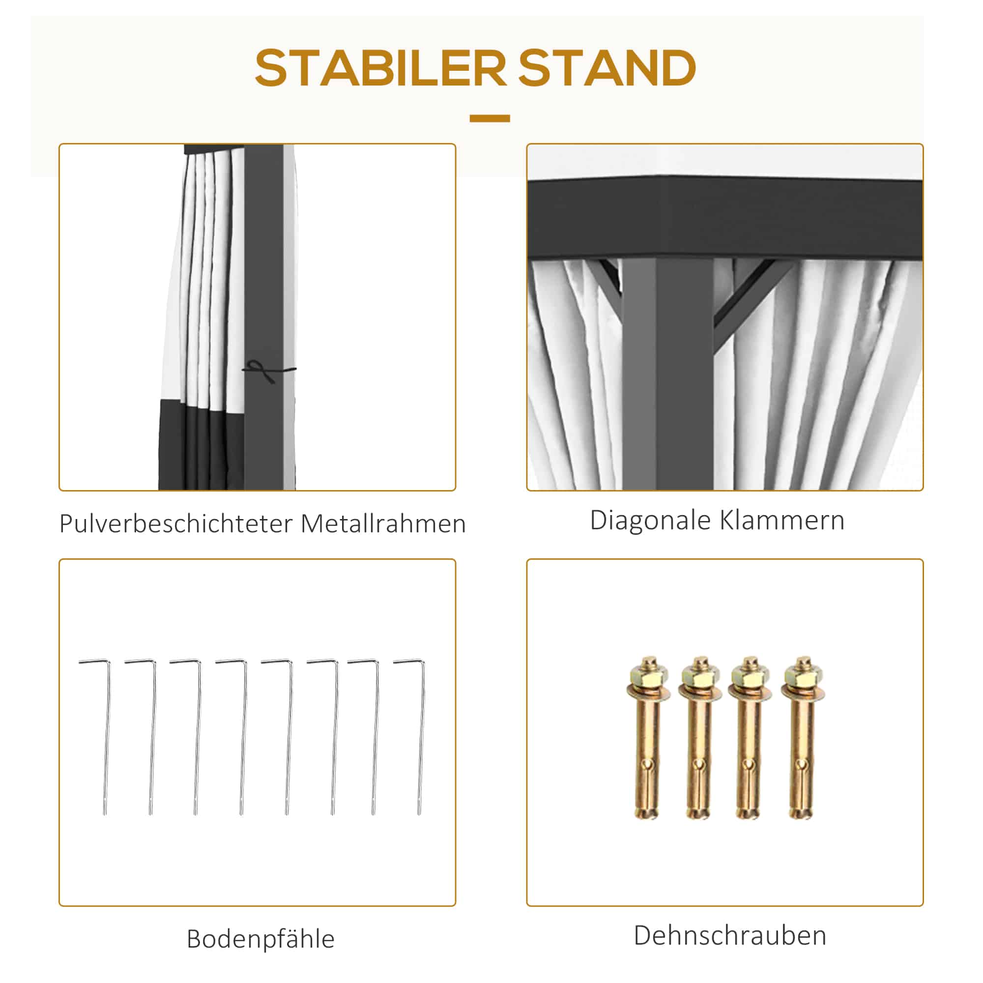 De levering omvat het paviljoen, 8 aardspiezen, 4 uitbreidingsschroeven, 4 scheerlijnen en instructies. Gratis levering tot aan de stoep. Zorg voor een correct adres en telefoonnummer voor een vlotte levering.