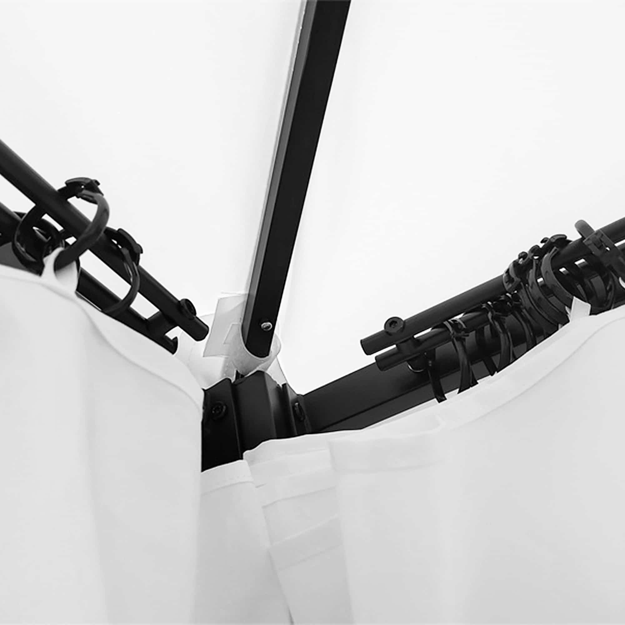 Het Tuinpaviljoen heeft een zwart-wit kleurstelling en is gemaakt van hoogwaardige materialen zoals ijzer en polyester. De totale afmetingen zijn 300 x 300 x 274 cm, met draaghoogte van 205 cm en dakhoogte van 202 cm. De kolomgrootte is 6 x 6 cm en de winddichtheid is niveau 5 bij gebruik van aardspiezen en niveau 6 bij gebruik van schroeven. Sneeuwbelastingscapaciteit is 5 kg/m².