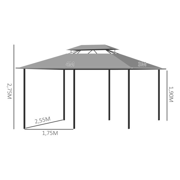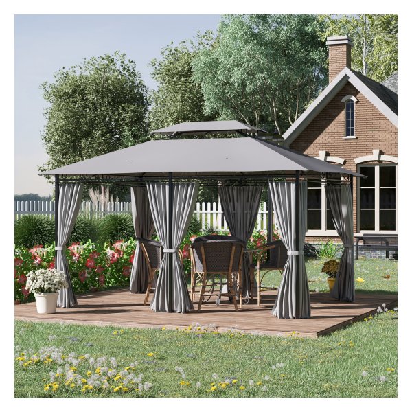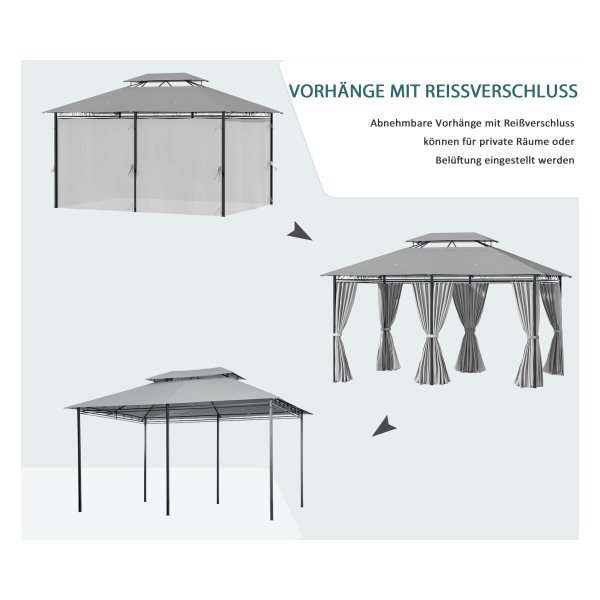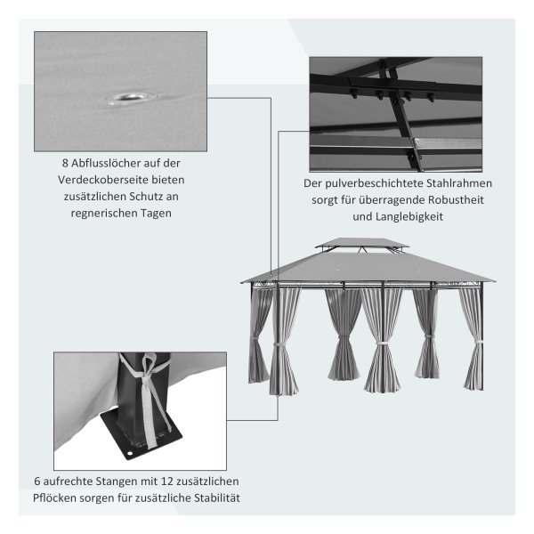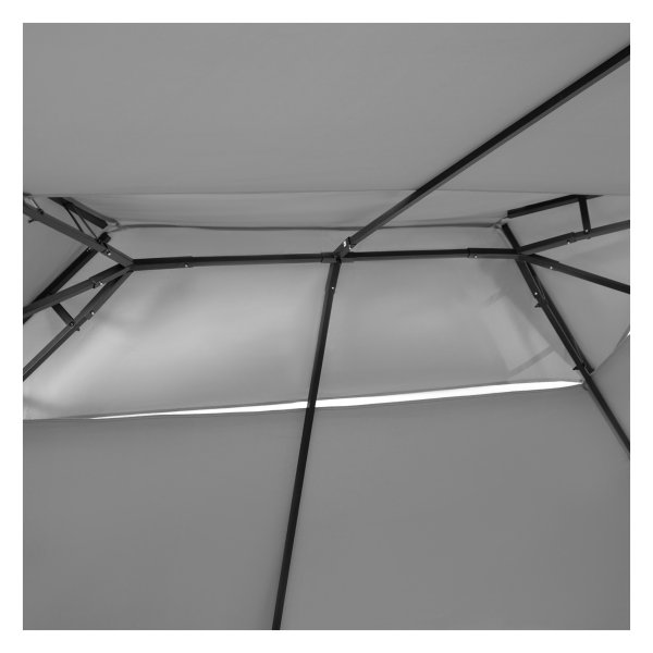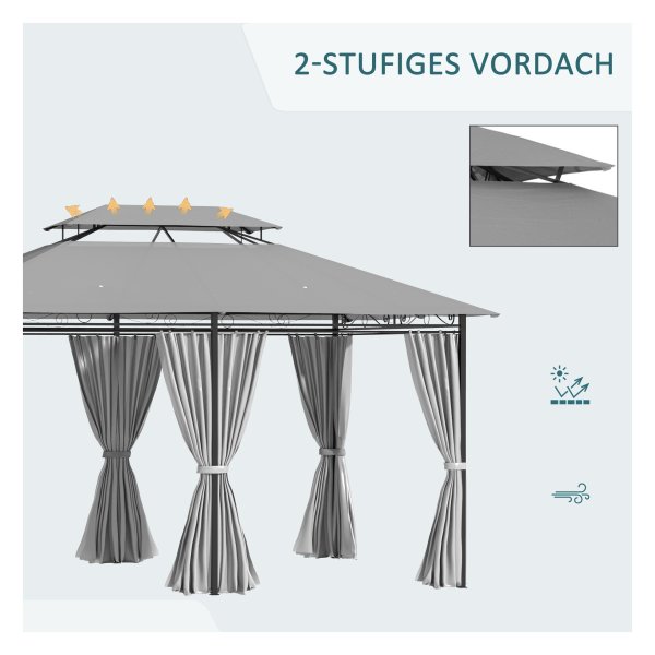 Het waterdichte dubbele dak van 180 g/m² dik polyester zorgt ervoor dat je veilig beschermd bent tegen zowel de zon als de regen. Met stijlvolle, grijze zijwanden biedt dit tuinpaviljoen niet alleen bescherming tegen de zon, maar ook een praktische afscheiding van de buitenwereld.