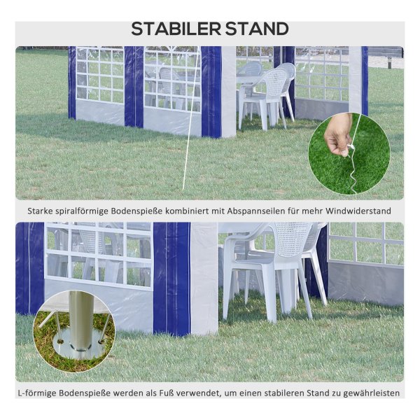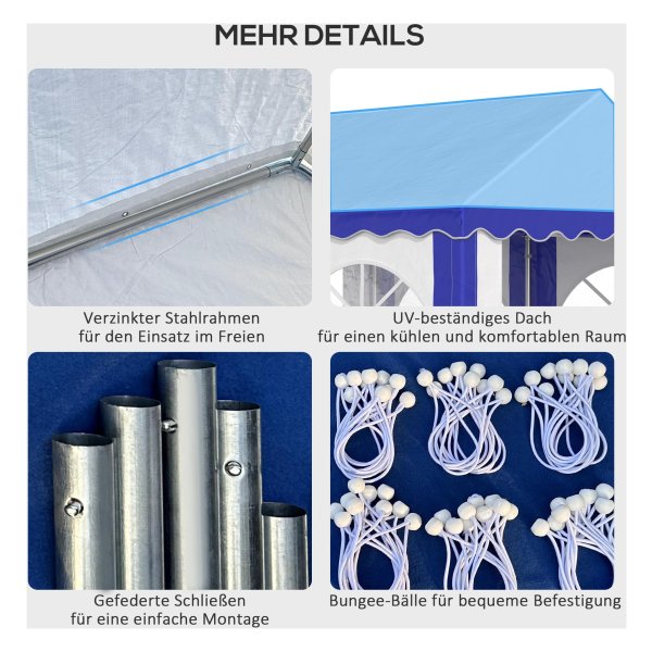 De feesttent heeft een metalen frame gemaakt van robuust en gegalvaniseerd staal, wat zorgt voor compromisloze stabiliteit. Hierdoor blijft de tent stevig staan, zelfs bij winderige omstandigheden. Het frame is eenvoudig te monteren en te demonteren, wat het opzetten van de tent gemakkelijk maakt.