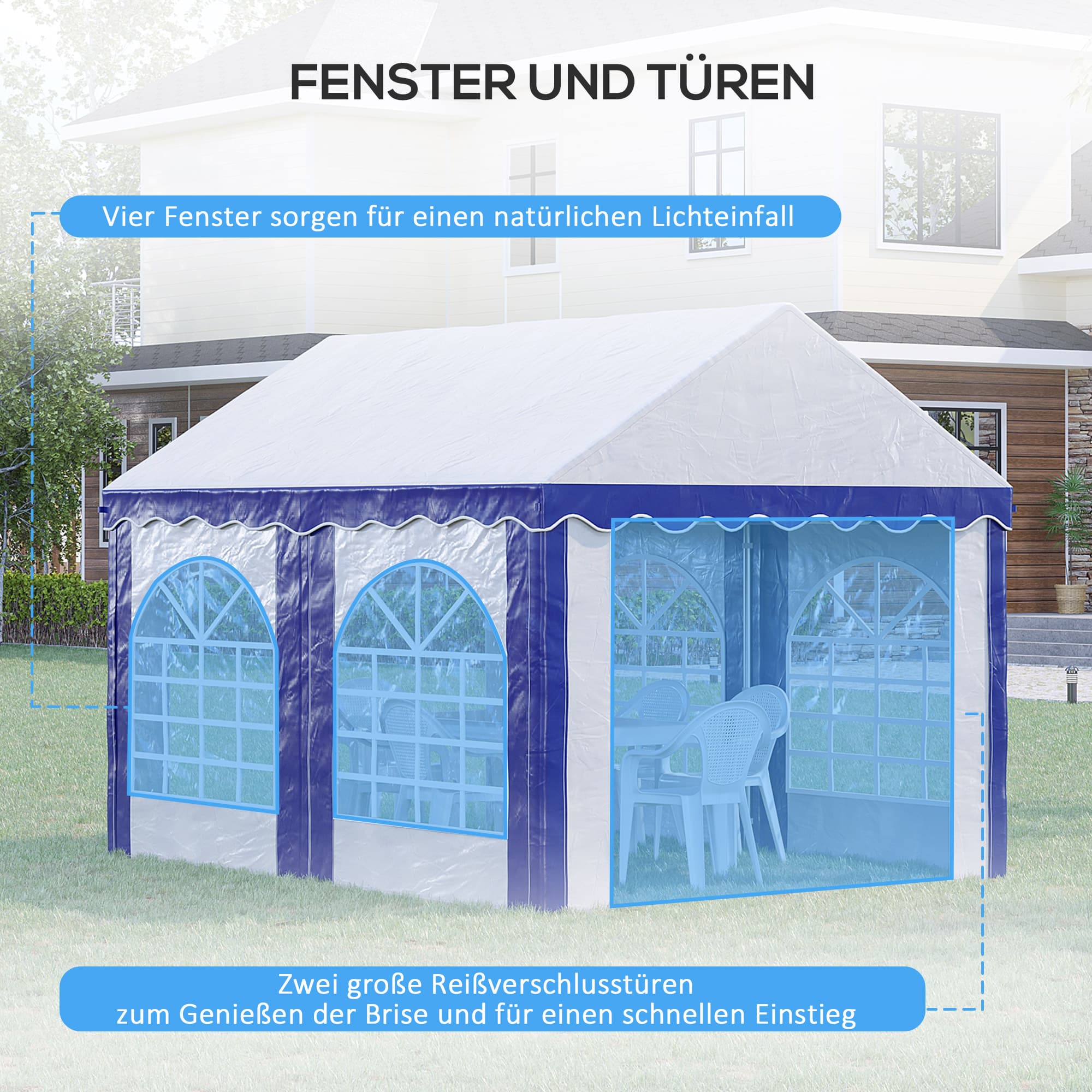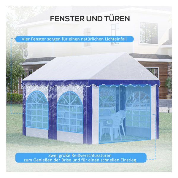 De feesttent beschikt over vier transparante PVC-vensters in een betegelde look, die zorgen voor een duidelijk zicht naar buiten en bescherming tegen de wind. Daarnaast zijn er twee deuren aanwezig, wat zorgt voor een comfortabele en vrije toegang tot de tent.