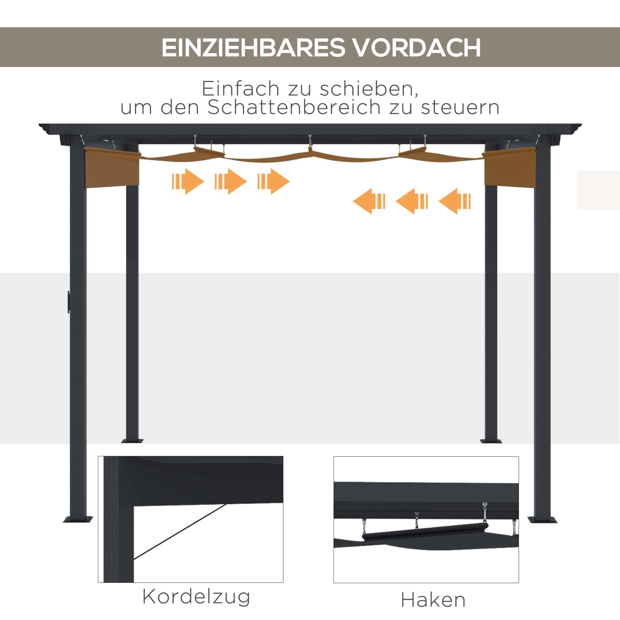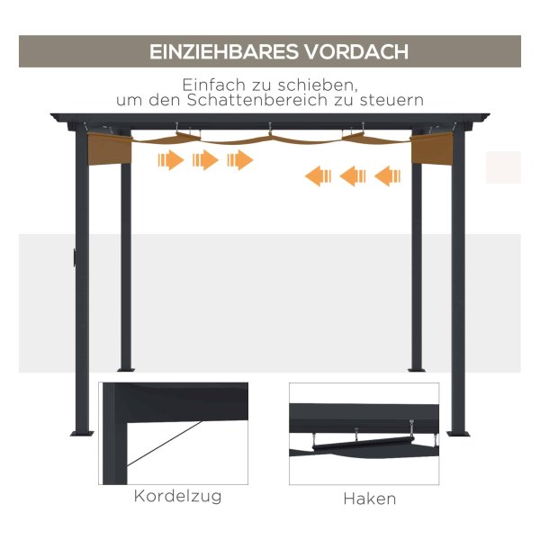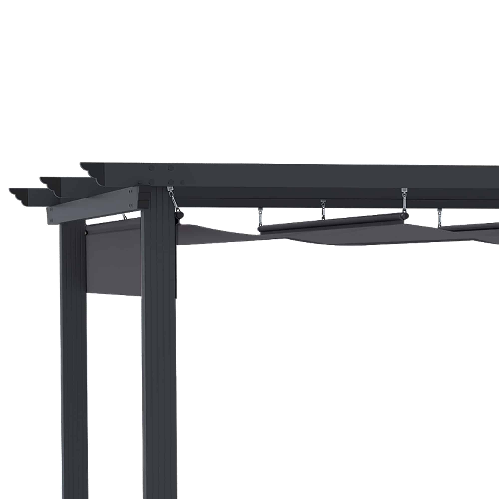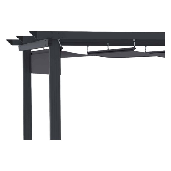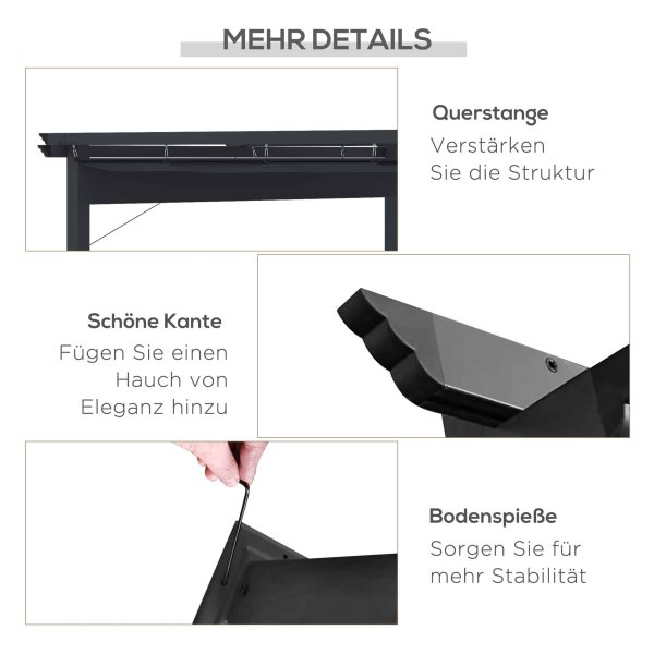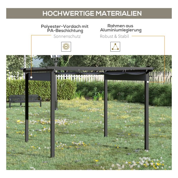 De grijze kleur met zwarte accenten geeft het terrasdak een moderne uitstraling die past bij elke stijl. Gemaakt van hoogwaardige materialen zoals aluminium en polyester voor duurzaamheid en betrouwbaarheid.