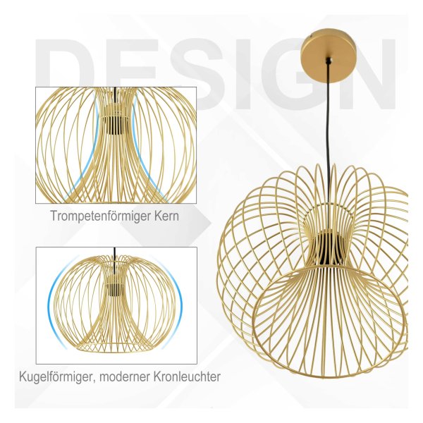 De hanglamp retrostijl is uitgevoerd in een prachtige goudkleur en gemaakt van hoogwaardig staal. Met een gewicht van 6 kg (inclusief hangende ketting) en een lengte van 120 cm is deze lamp een indrukwekkende toevoeging aan elk interieur. De lamp is geschikt voor E27 lampen met een vermogen van 40W en een ingangsspanning van 230V/50Hz. Bovendien is de hanglamp gecertificeerd volgens CE-LVD en ROHS standaarden.