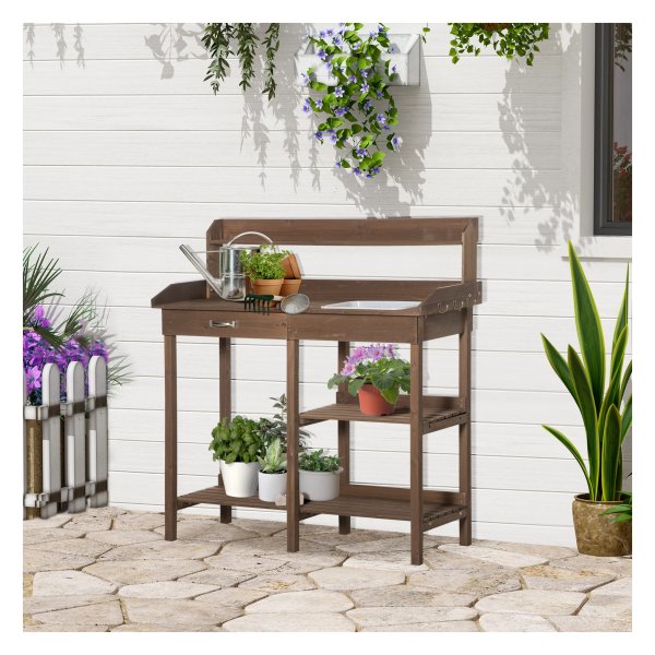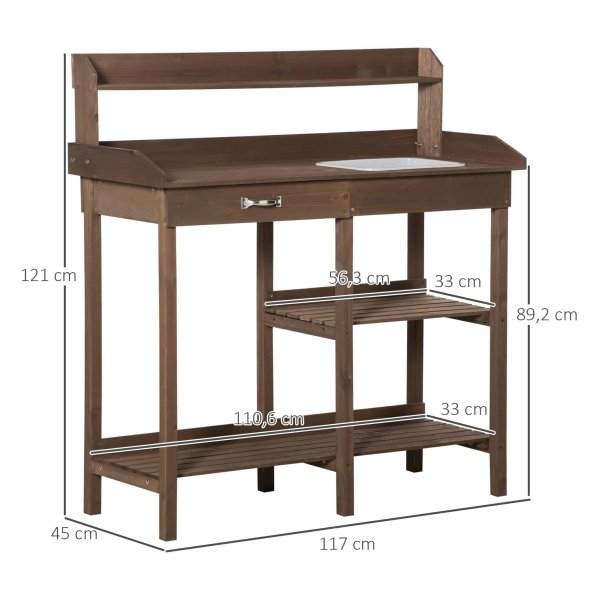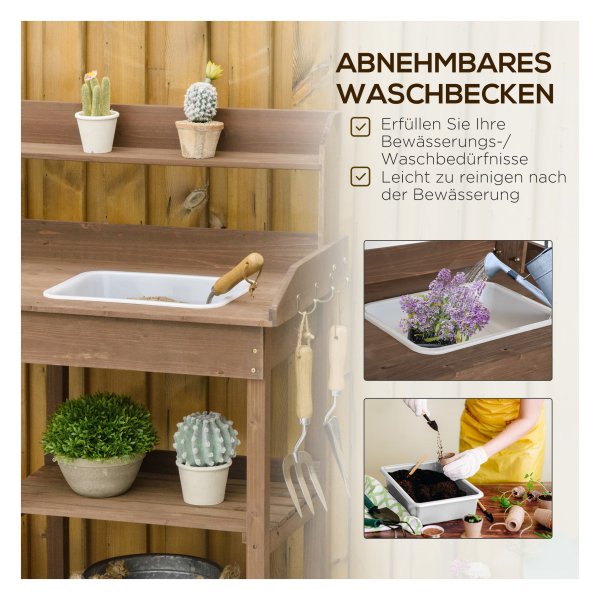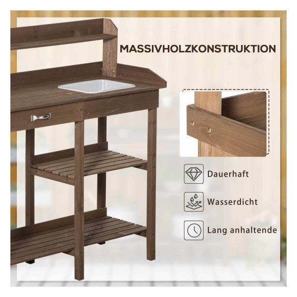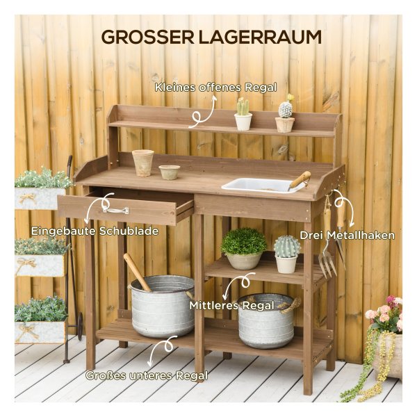 Met een werkgebied op een aangename hoogte is deze bloementafel ideaal voor het verzorgen van je planten. De ingebouwde gootsteen maakt het gemakkelijk om water te geven en potgrond te gebruiken zonder rommel te maken. Daarnaast bieden de twee planken voldoende ruimte voor al je potten en planten, terwijl de lade met metalen handvat veilige opslag biedt voor je tuingereedschap.