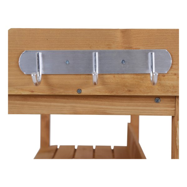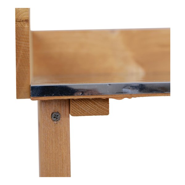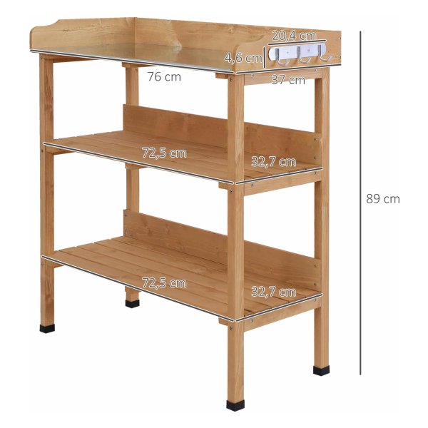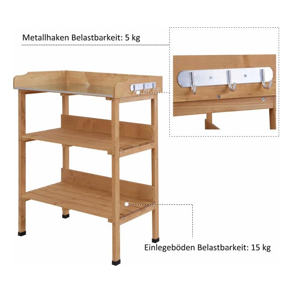 De plantentafel heeft een bovenste plaat met een metalen kussen voor extra stabiliteit. Daarnaast beschikt de tafel over drie metalen haken waar u tuingereedschap, schalen of handschoenen aan kunt hangen. Zo heeft u alle benodigdheden altijd binnen handbereik, waardoor tuinieren nog gemakkelijker wordt.